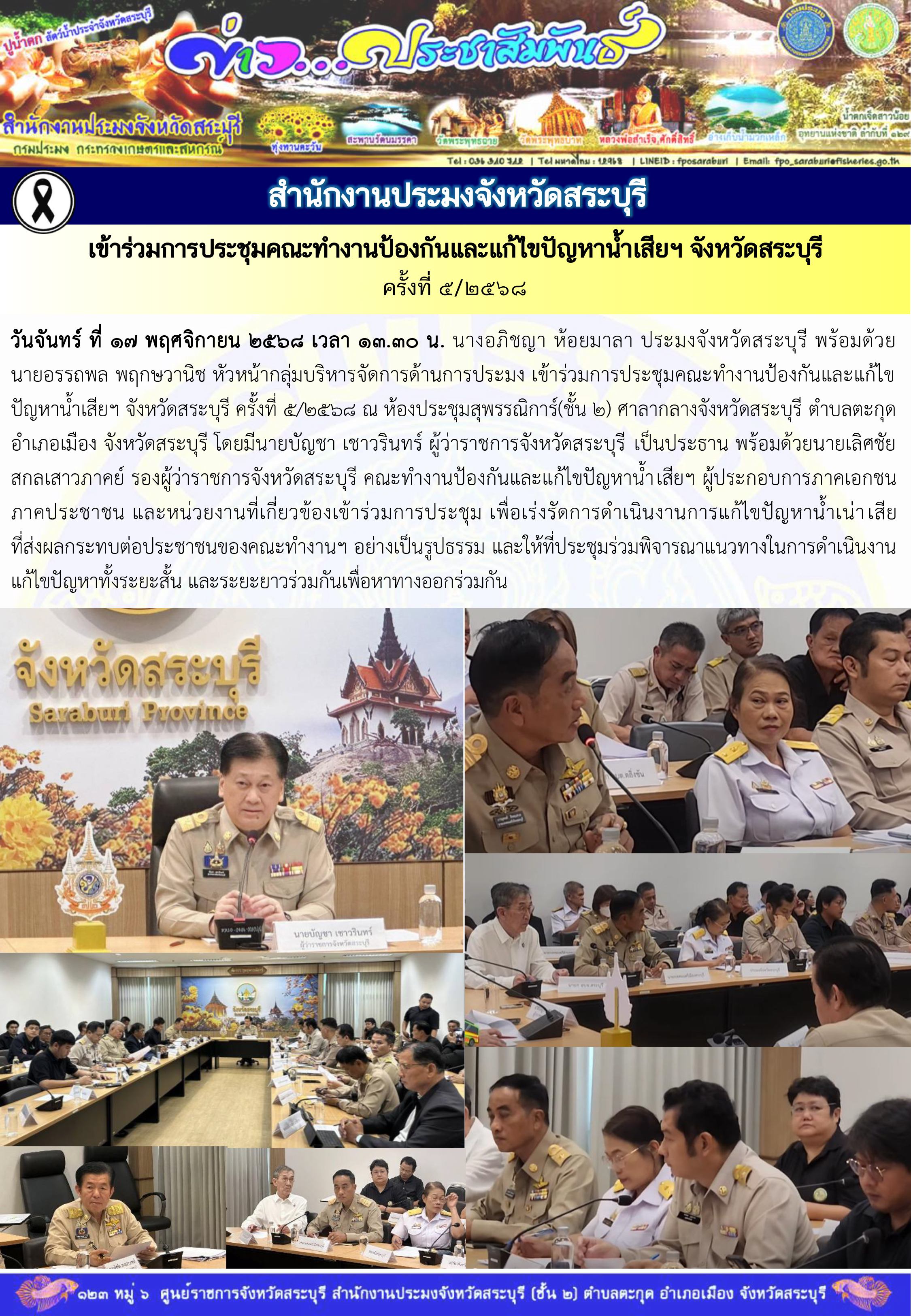 วันจันทร์ ที่ ๑๗ พฤศจิกายน ๒๕๖๘ เวลา ๑๓.๓๐ น. นางอภิชญา ห้อยมาลา ประมงจังหวัดสระบุรี พร้อมด้วยนายอรรถพล พฤกษวานิช หัวหน้ากลุ่มบริหารจัดการด้านการประมง เข้าร่วมการประชุมคณะทำงานป้องกันและแก้ไขปัญหาน้ำเสียฯ จังหวัดสระบุรี ครั้งที่ ๕/๒๕๖๘ ณ ห้องประชุมสุพรรณิการ์(ชั้น ๒)ศาลากลางจังหวัดสระบุรี ตำบลตะกุด อำเภอเมือง จังหวัดสระบุรี โดยมีนายบัญชา เชาวรินทร์ ผู้ว่าราชการจังหวัดสระบุรี เป็นประธาน พร้อมด้วยนายเลิศชัย สกลเสาวภาคย์ รองผู้ว่าราชการจังหวัดสระบุรี คณะทำงานป้องกันและแก้ไขปัญหาน้ำเสียฯ ผู้ประกอบการภาคเอกชน ภาคประชาชน และหน่วยงานที่เกี่ยวข้องเข้าร่วมการประชุม เพื่อเร่งรัดการดำเนินงานการแก้ไขปัญหาน้ำเน่าเสียที่ส่งผลกระทบต่อประชาชนของคณะทำงานฯ อย่างเป็นรูปธรรม และให้ที่ประชุมร่วมพิจารณาแนวทางในการดำเนินงานแก้ไขปัญหาทั้งระยะสั้น และระยะยาวร่วมกันเพื่อหาทางออกร่วมกัน