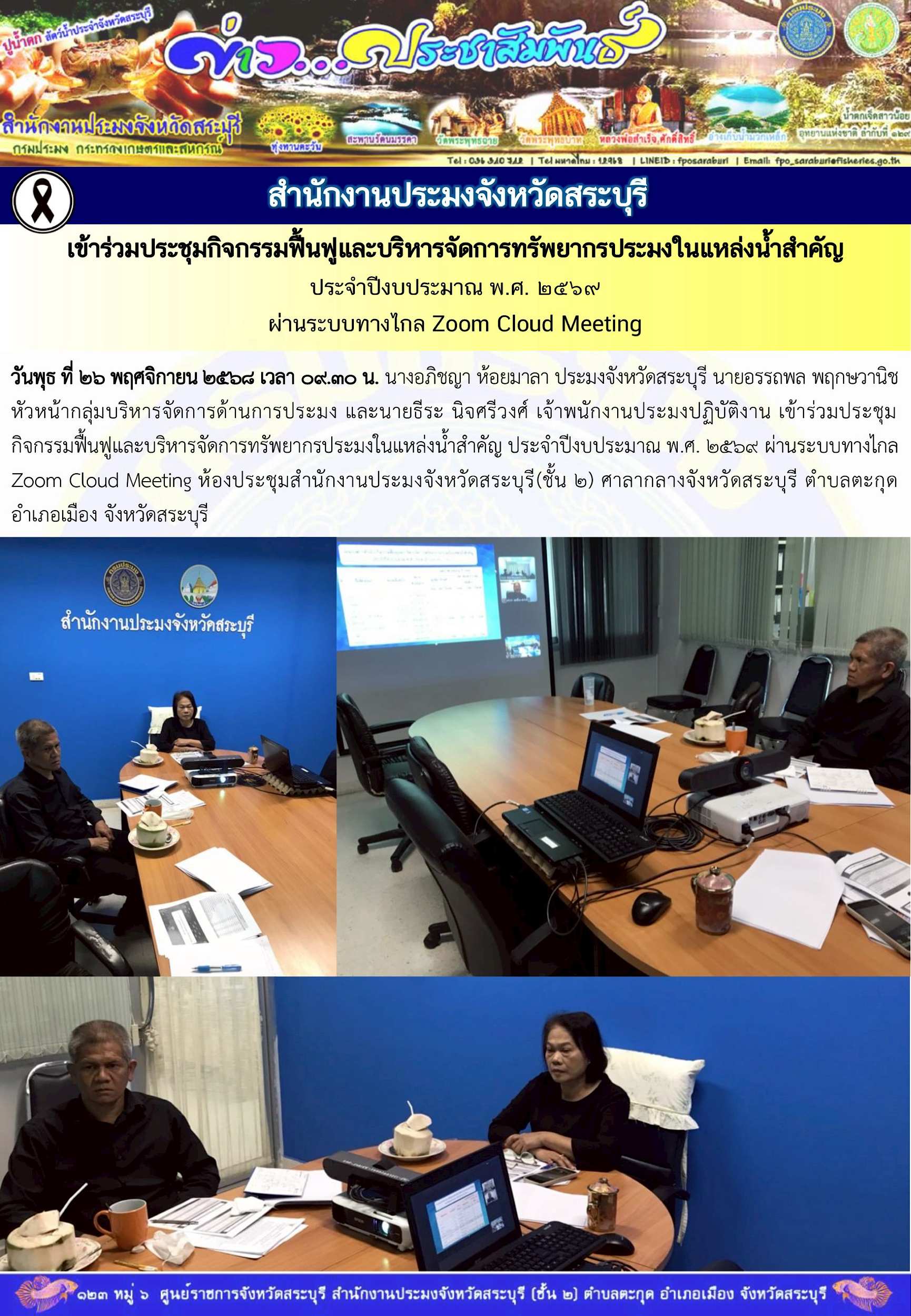 สำนักงานประมงจังหวัดสระบุรี เข้าร่วมประชุมกิจกรรมฟื้นฟูและบริหารจัดการทรัพยากรประมงในแหล่งน้ำสำคัญ ประจำปีงบประมาณ พ.ศ. ๒๕๖๙ ผ่านระบบทางไกล Zoom Cloud Meeting