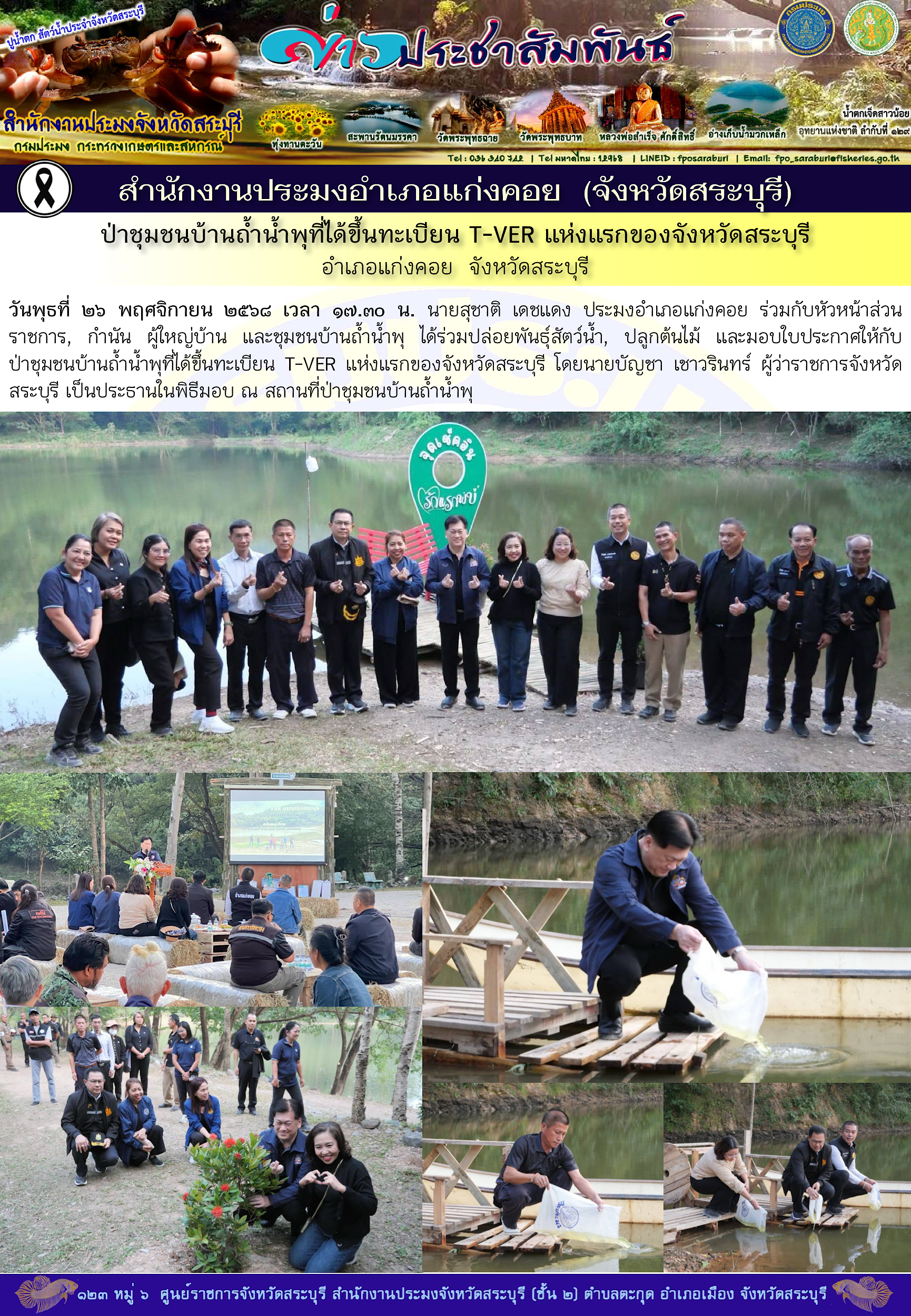 วันพุธที่ ๒๖ พฤศจิกายน ๒๕๖๘ เวลา ๑๗.๓๐ น. นายสุชาติ เดชแดง ประมงอำเภอแก่งคอย ร่วมกับหัวหน้าส่วนราชการ, กำนัน ผู้ใหญ่บ้าน และชุมชนบ้านถ้ำน้ำพุ ได้ร่วมปล่อยพันธุ์สัตว์น้ำ, ปลูกต้นไม้ และมอบใบประกาศให้กับป่าชุมชนบ้านถ้ำน้ำพุที่ได้ขึ้นทะเบียน T-VER แห่งแรกของจังหวัดสระบุรี โดยนายบัญชา เชาวรินทร์ ผู้ว่าราชการจังหวัดสระบุรี เป็นประธานในพิธีมอบ ณ สถานที่ป่าชุมชนบ้านถ้ำน้ำพุ