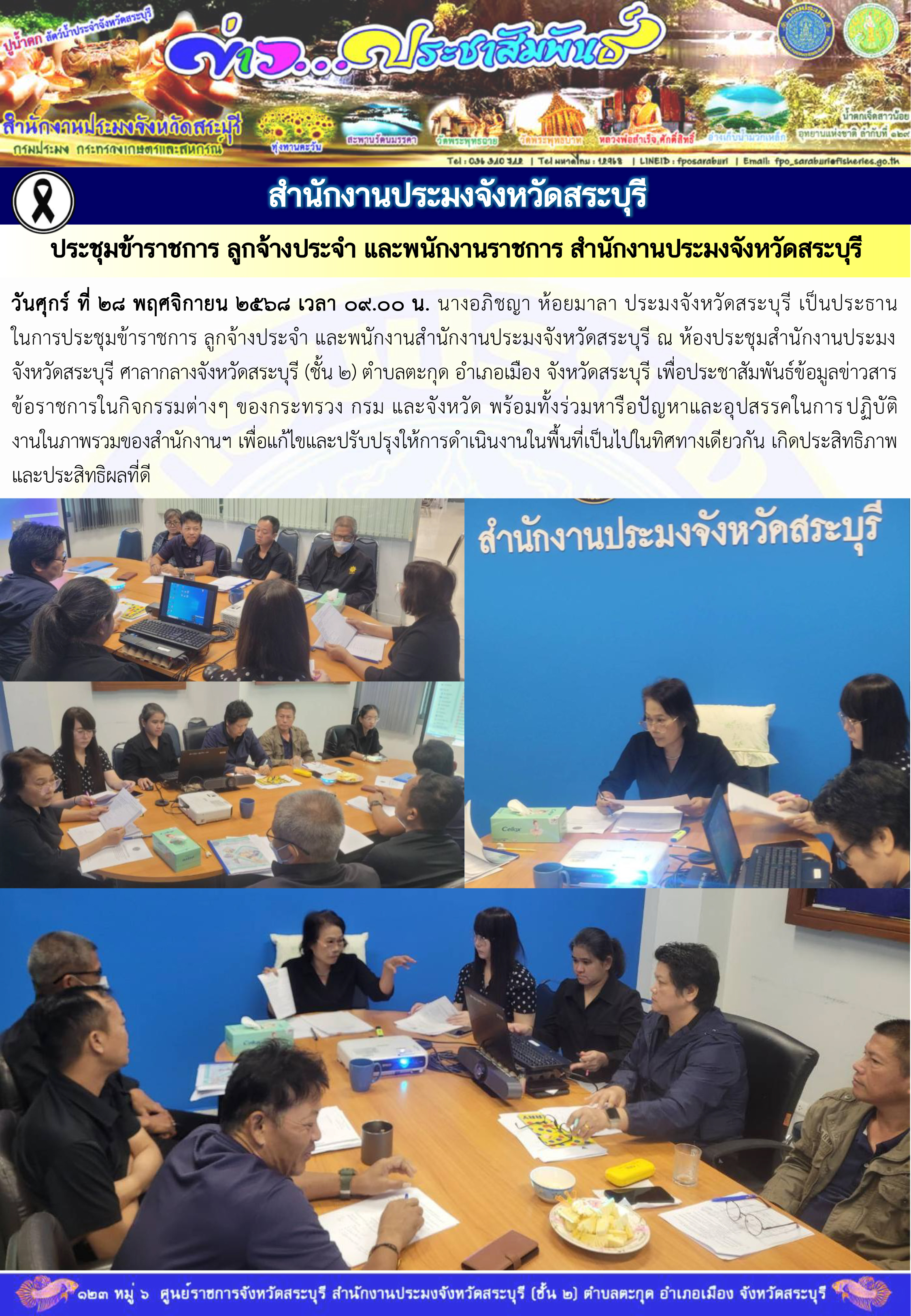 วันศุกร์ ที่ ๒๘ พฤศจิกายน ๒๕๖๘ เวลา ๐๙.๐๐ น. นางอภิชญา ห้อยมาลา ประมงจังหวัดสระบุรี เป็นประธาน ในการประชุมข้าราชการ ลูกจ้างประจำ และพนักงานสำนักงานประมงจังหวัดสระบุรี ณ ห้องประชุมสำนักงานประมงจังหวัดสระบุรี ศาลากลางจังหวัดสระบุรี (ชั้น ๒) ตำบลตะกุด อำเภอเมือง จังหวัดสระบุรี เพื่อประชาสัมพันธ์ข้อมูลข่าวสาร ข้อราชการในกิจกรรมต่างๆ ของกระทรวง กรม และจังหวัด พร้อมทั้งร่วมหารือปัญหาและอุปสรรคในการปฏิบัติงานในภาพรวมของสำนักงานฯ เพื่อแก้ไขและปรับปรุงให้การดำเนินงานในพื้นที่เป็นไปในทิศทางเดียวกัน เกิดประสิทธิภาพและประสิทธิผลที่ดี