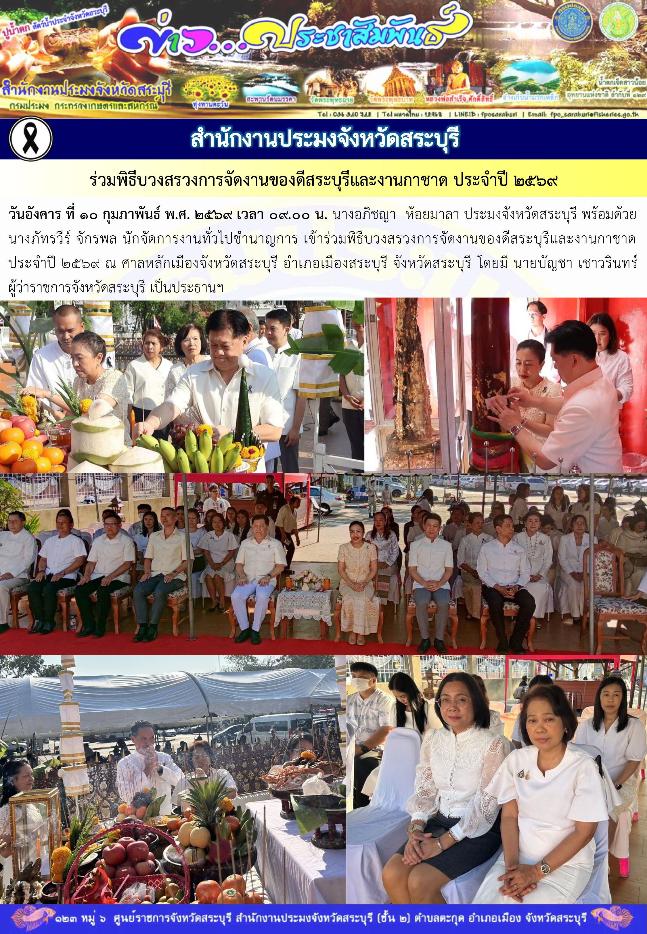 วันอังคาร ที่ 10 กุมภาพันธ์ พ.ศ. 2569 เวลา 09.00 น. นางอภิชญา  ห้อยมาลา ประมงจังหวัดสระบุรี พร้อมด้วยนางภัทรวีร์ จักรพล นักจัดการงานทั่วไปชำนาญการ เข้าร่วมพิธีบวงสรวงการจัดงานของดีสระบุรีและงานกาชาด ประจำปี 2569 ณ ศาลหลักเมืองจังหวัดสระบุรี อำเภอเมืองสระบุรี จังหวัดสระบุรี โดยมี นายบัญชา เชาวรินทร์ ผู้ว่าราชการจังหวัดสระบุรี เป็นประธานฯ
