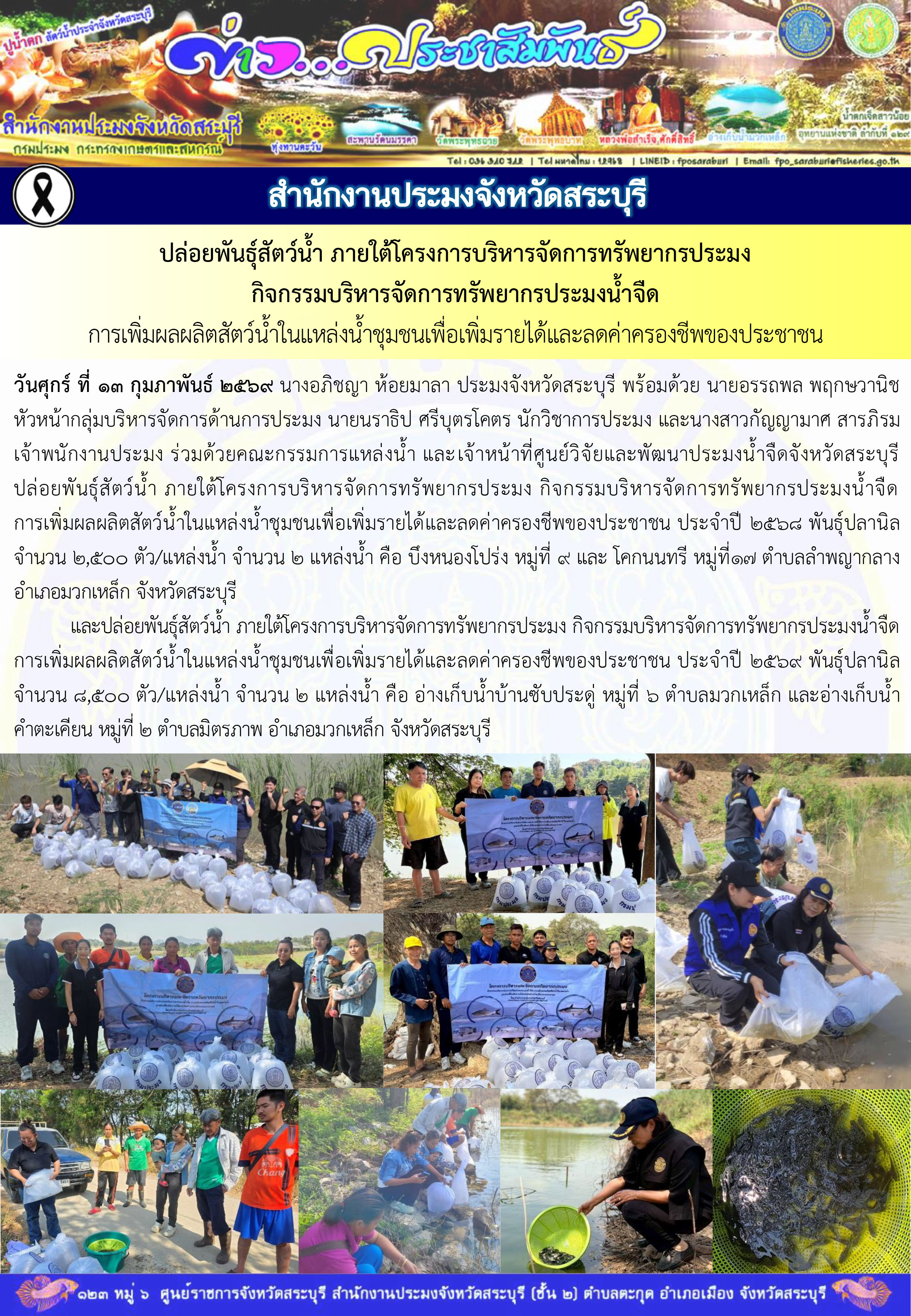 ภารกิจประจำวันที่ 13 กุมภาพันธ์ 2569 สำนักงานประมงจังหวัดสระบุรี