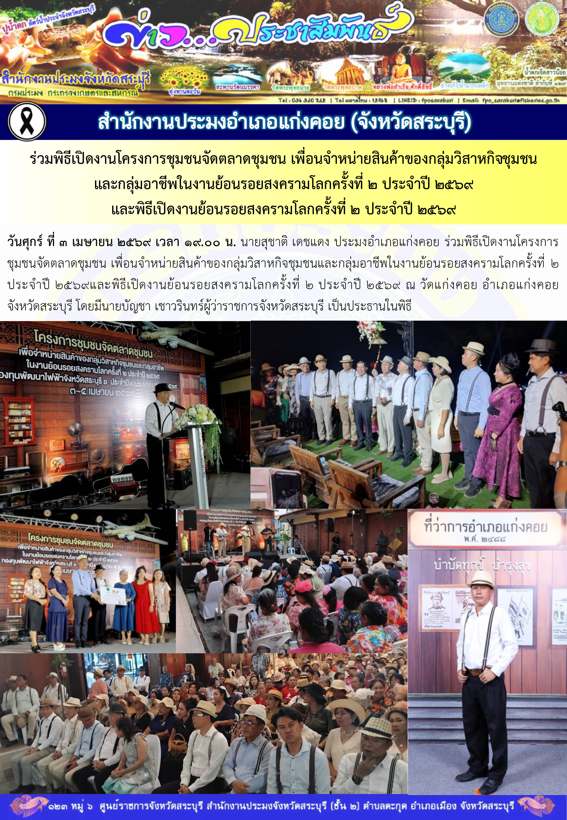 วันศุกร์ ที่ 3 เมษายน 2569 เวลา 19.00 น. นายสุชาติ เดชแดง ประมงอำเภอแก่งคอย ร่วมพิธีเปิดงานโครงการชุมชนจัดตลาดชุมชน เพื่อนจำหน่ายสินค้าของกลุ่มวิสาหกิจชุมชนและกลุ่มอาชีพในงานย้อนรอยสงครามโลกครั้งที่ 2 ประจำปี 2569และพิธีเปิดงานย้อนรอยสงครามโลกครั้งที่ 2 ประจำปี 2569 ณ วัดแก่งคอย อำเภอแก่งคอย จังหวัดสระบุรี โดยมีนายบัญชา เชาวรินทร์ผู้ว่าราชการจังหวัดสระบุรี เป็นประธานในพิธี