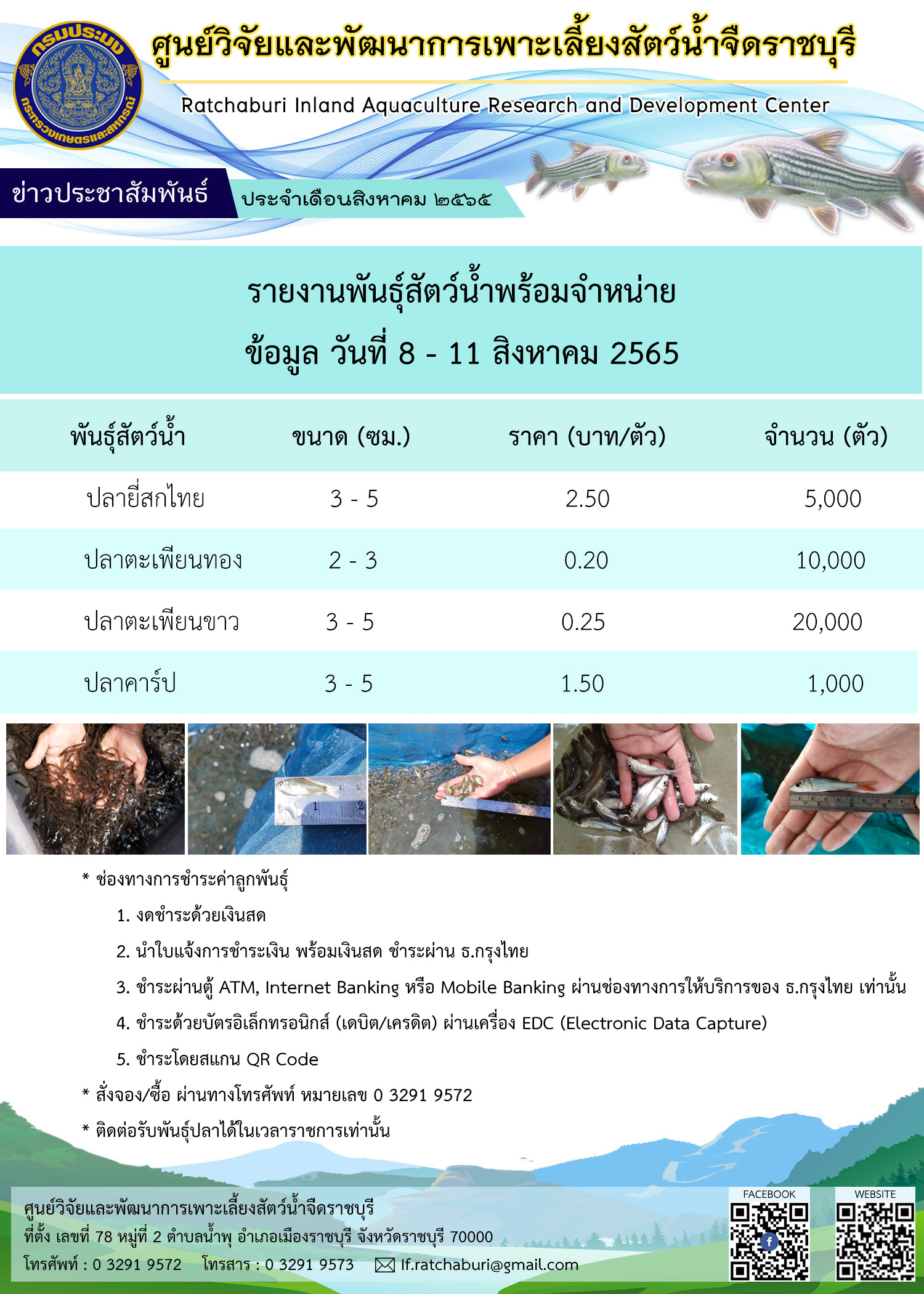พันธุ์สัตว์น้ำพร้อมจำหน่าย วันที่ 8 - 11 สิงหาคม 2565