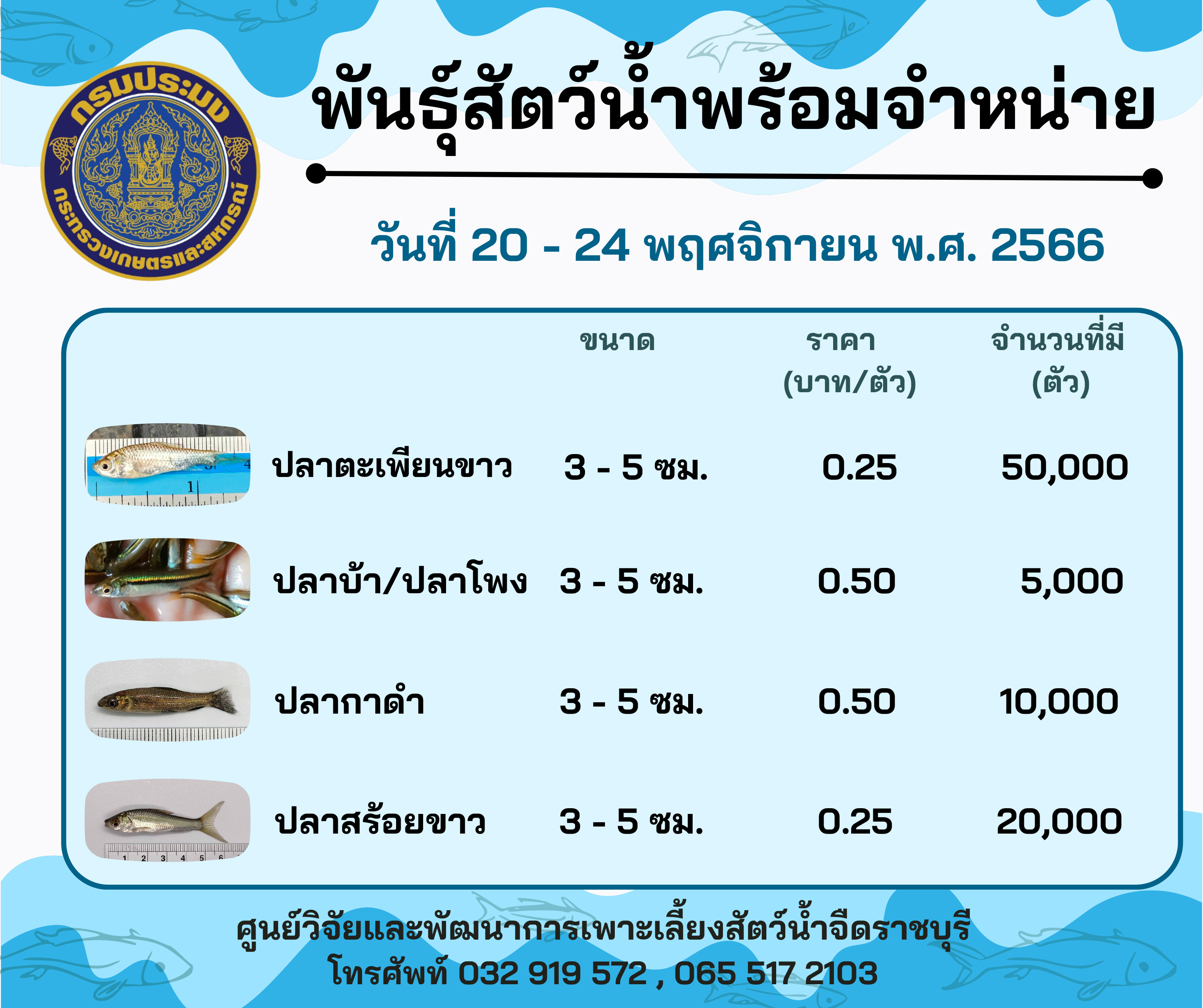 ลูกพันธุ์สัตว์น้ำพร้อมจำหน่าย ประจำวันที่ 20 - 24 พฤศจิกายน พ.ศ. 2566
