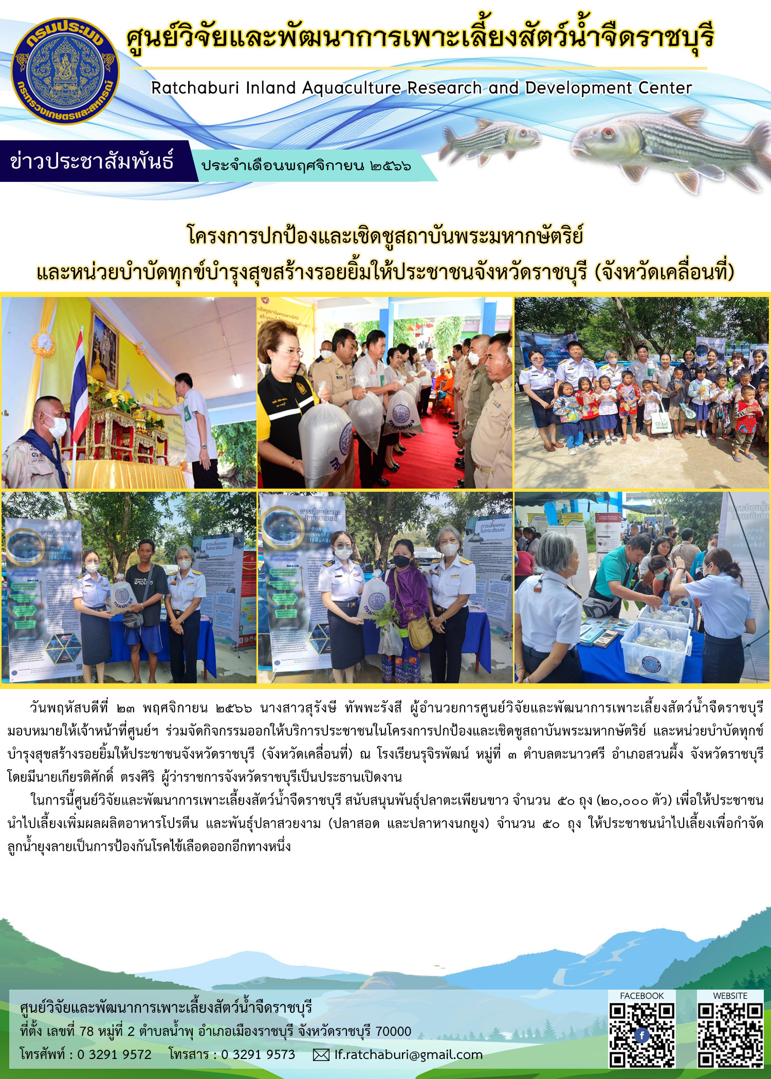 วันพฤหัสบดีที่ 23 พฤศจิกายน 2566 นางสาวสุรังษี ทัพพะรังสี ผู้อำนวยการศูนย์วิจัยและพัฒนาการเพาะเลี้ยงสัตว์น้ำจืดราชบุรี มอบหมายให้เจ้าหน้าที่ศูนย์ฯ ร่วมจัดกิจกรรมออกหน่วยบริการประชาชนในโครงการปกป้องและเชิดชูสถาบันพระมหากษัตริย์ และหน่วยบำบัดทุกข์บำรุงสุขสร้างรอยยิ้มให้ประชาชนจังหวัดราชบุรี (จังหวัดเคลื่อนที่) ณ โรงเรียนรุจิรพัฒน์ หมู่ที่ 3 ตำบลตะนาวศรี อำเภอสวนผึ้ง จังหวัดราชบุรี โดยมีนายเกียรติศักดิ์ ตรงศิริ ผู้ว่าราชการจังหวัดราชบุรีเป็นประธานเปิดงาน