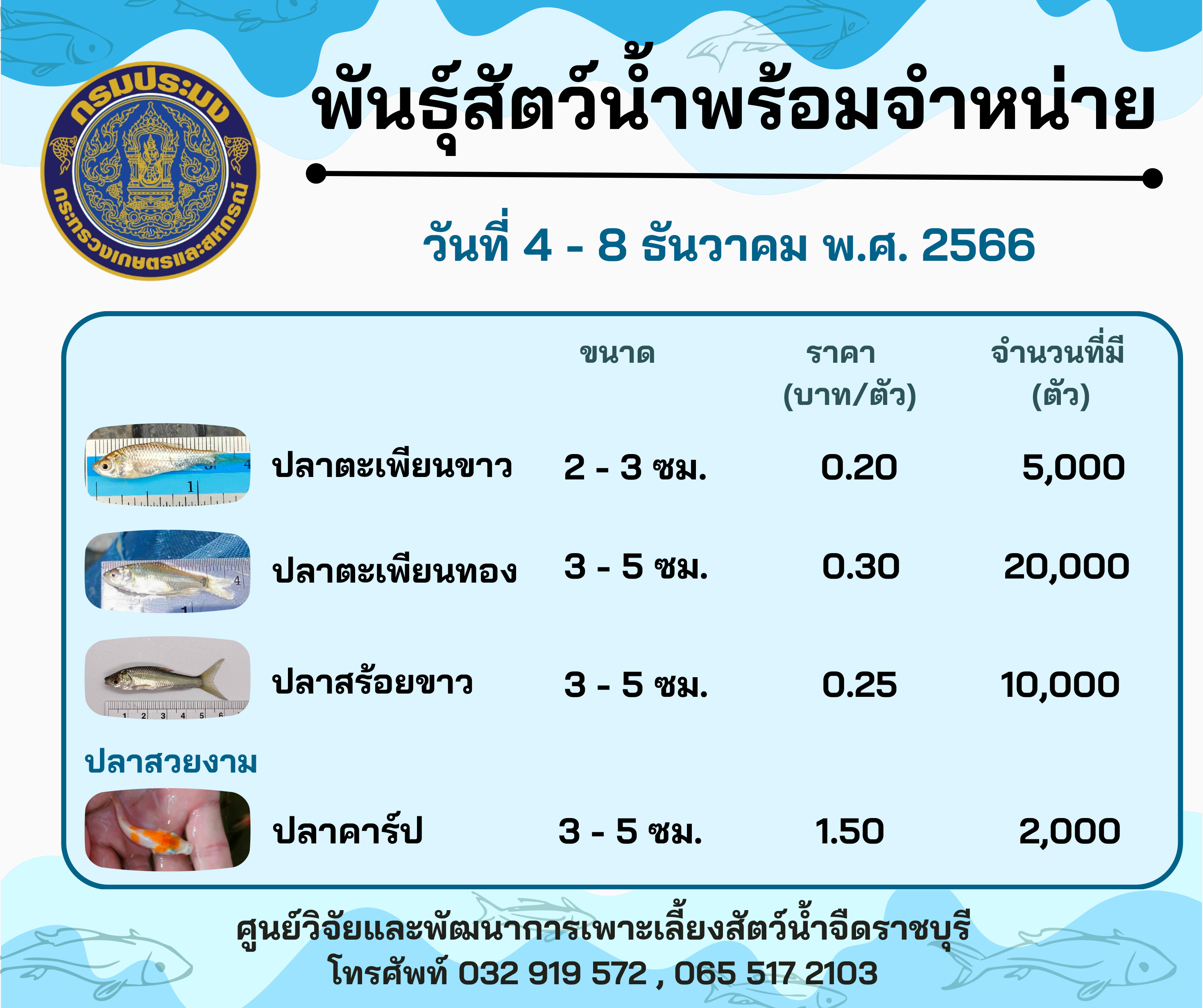 ลูกพันธุ์สัตว์น้ำพร้อมจำหน่าย ประจำวันที่ 4 - 8 ธันวาคม พ.ศ. 2566