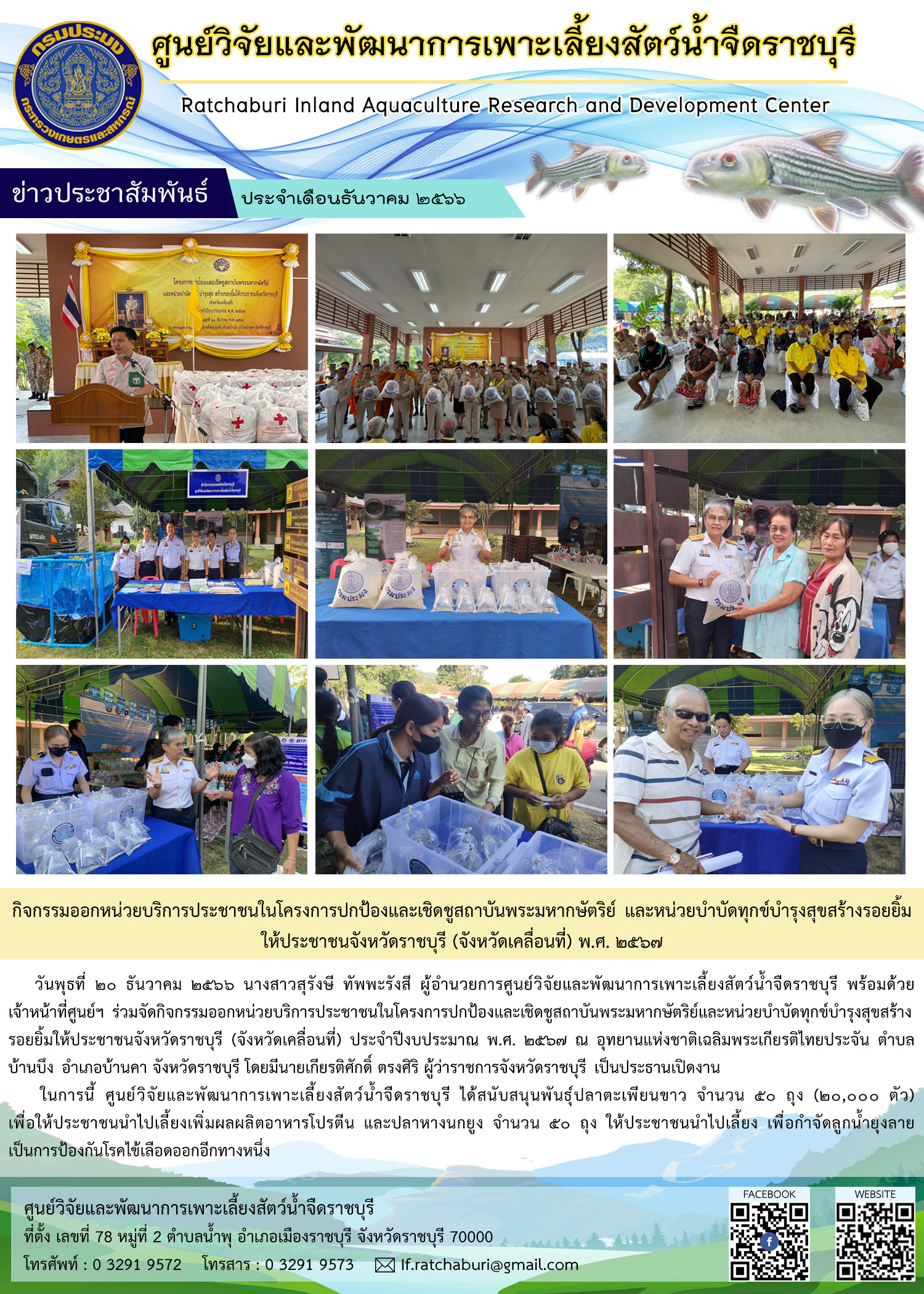 วันพุธที่ 20 ธันวาคม 2566 นางสาวสุรังษี ทัพพะรังสี ผู้อำนวยการศูนย์วิจัยและพัฒนาการเพาะเลี้ยงสัตว์น้ำจืดราชบุรี พร้อมด้วยเจ้าหน้าที่ศูนย์ฯ ร่วมจัดกิจกรรมออกหน่วยบริการประชาชนในโครงการปกป้องและเชิดชูสถาบันพระมหากษัตริย์ และหน่วยบำบัดทุกข์บำรุงสุขสร้างรอยยิ้มให้ประชาชนจังหวัดราชบุรี (จังหวัดเคลื่อนที่) พ.ศ. 2567 ณ อุทยานแห่งชาติเฉลิมพระเกียรติไทยประจัน ตำบลบ้านบึง อำเภอบ้านคา จังหวัดราชบุรี มีนายเกียรติศักดิ์ ตรงศิริ ผู้ว่าราชการจังหวัดราชบุรี เป็นประธานเปิดงาน