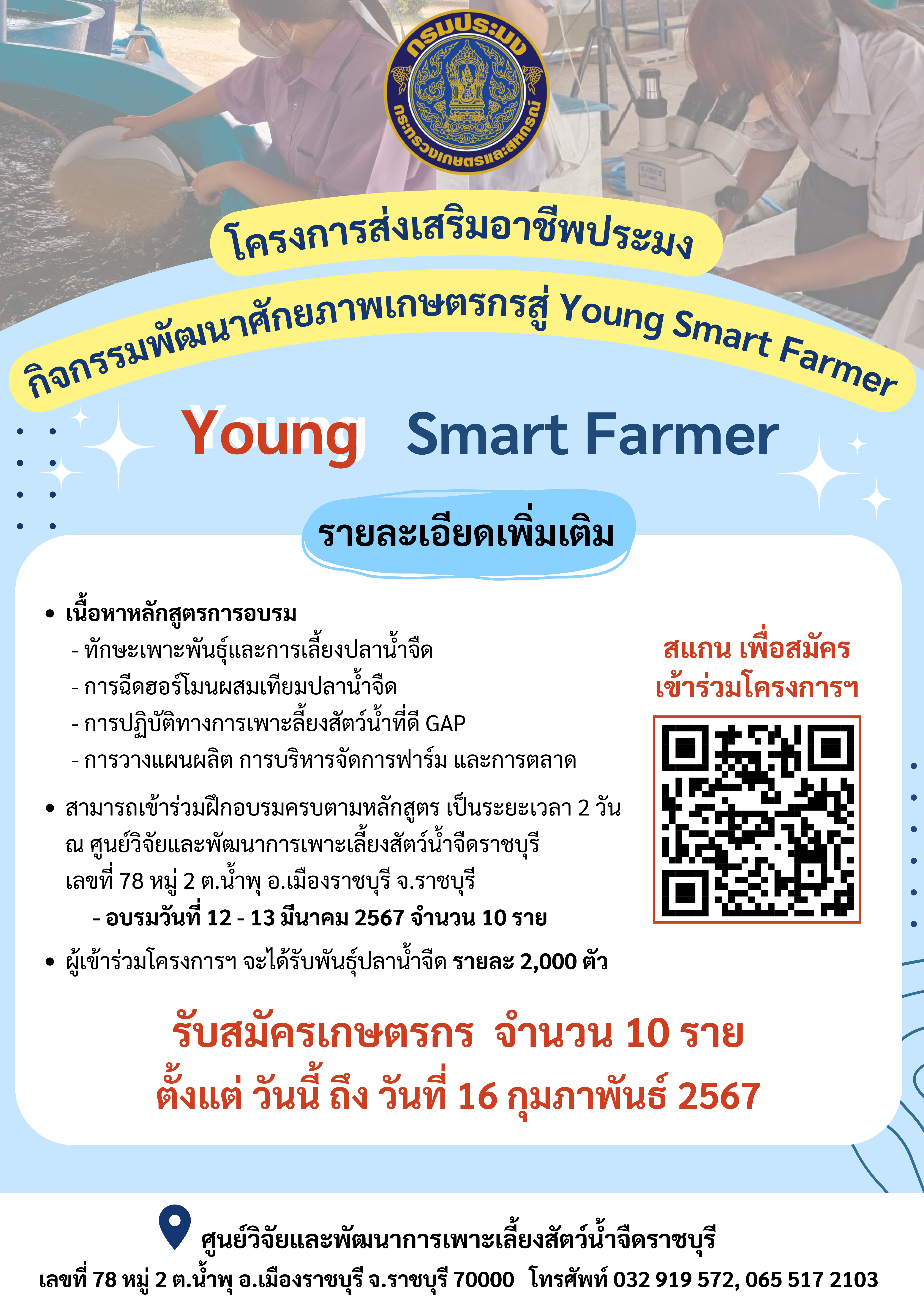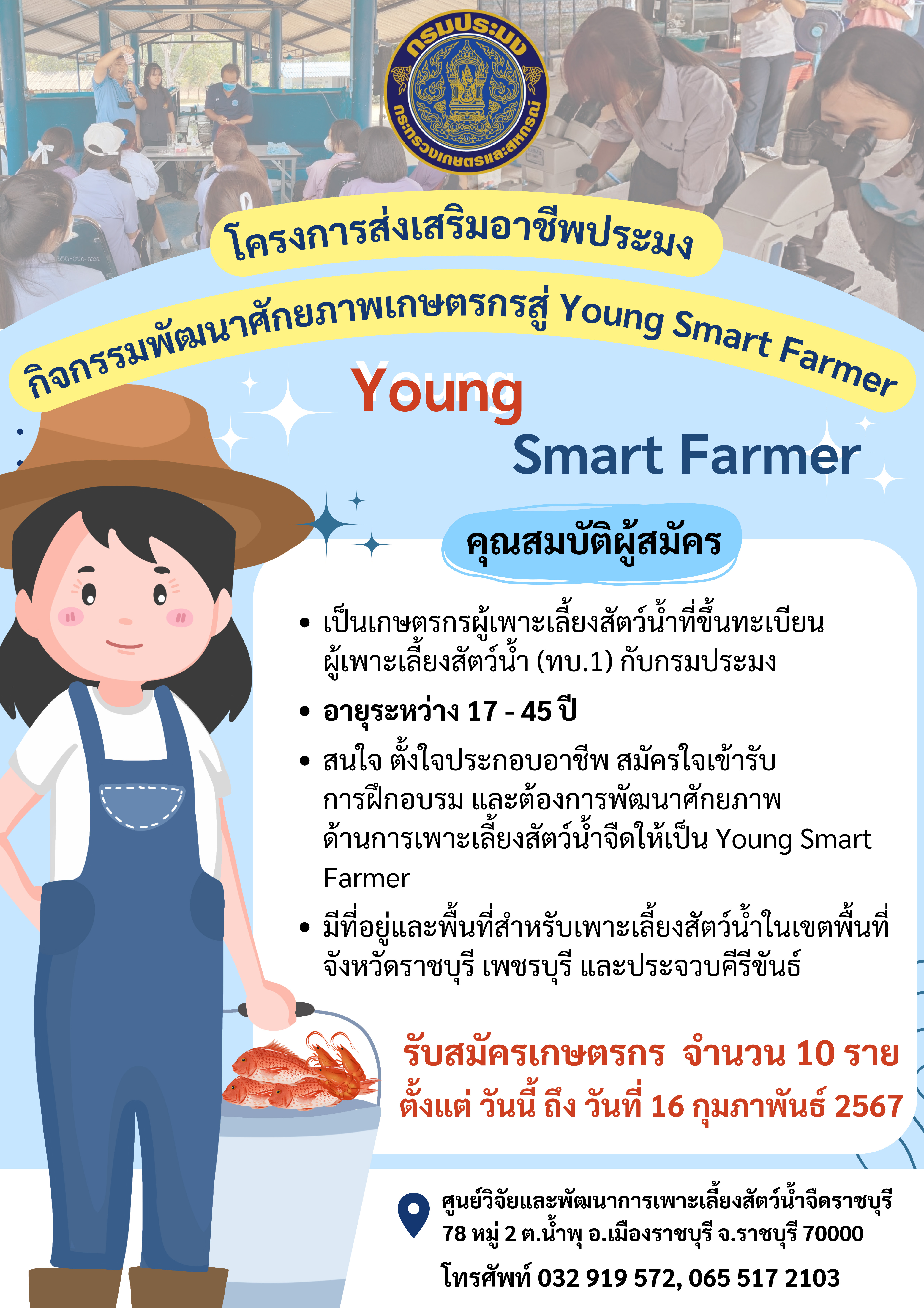 รับสมัครเกษตรกร อายุ 17- 45 ปี เข้าร่วมโครงการส่งเสริมอาชีพการประมง กิจกรรมพัฒนาศักยภาพเกษตรกรสู่ Young Smart Farmer พ.ศ. 2567