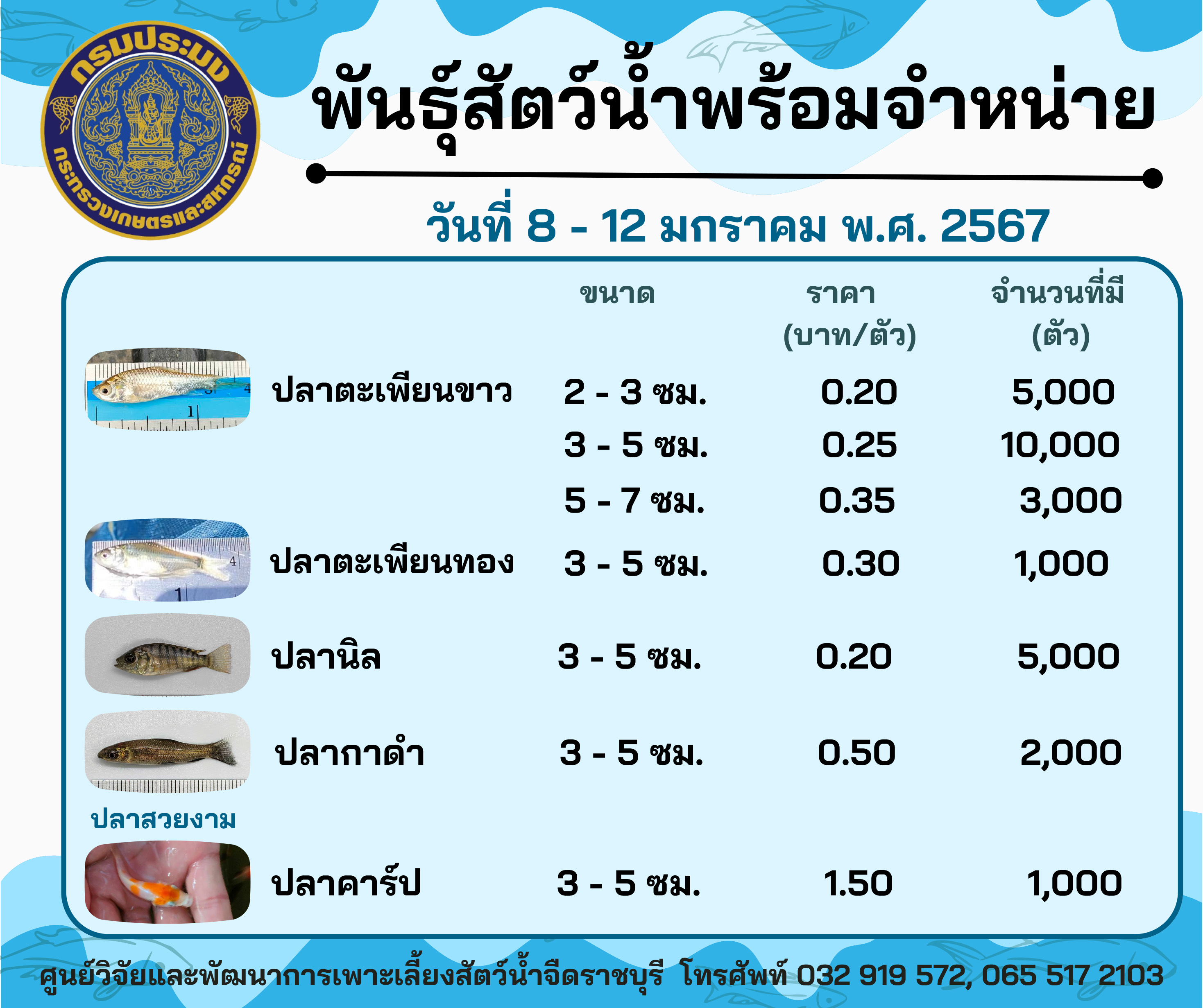 ลูกพันธุ์สัตว์น้ำพร้อมจำหน่าย ประจำวันที่ 8 - 12 มกราคม พ.ศ. 2567