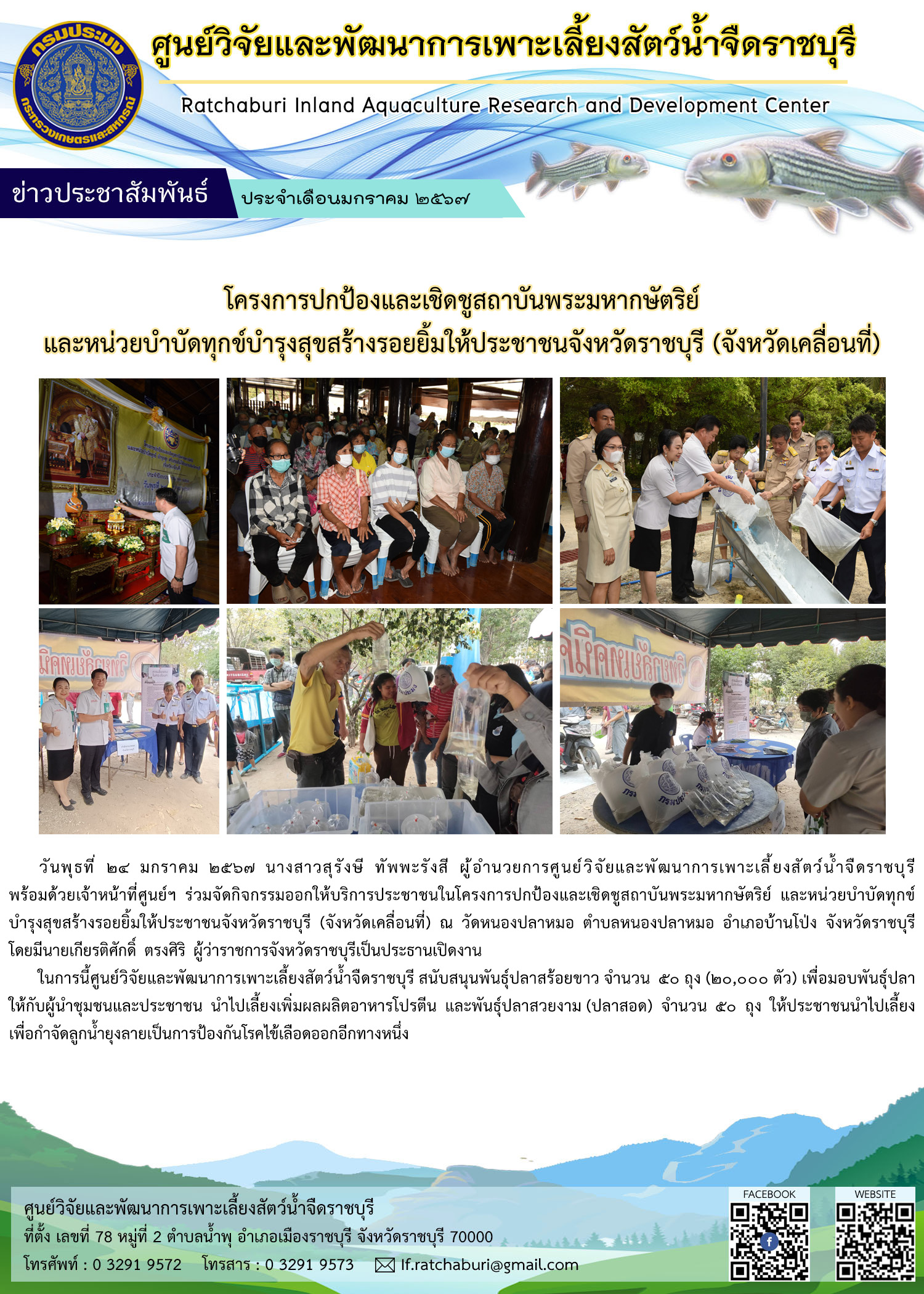 วันพุธที่ 25 มกราคม 2567 นางสาวสุรังษี ทัพพะรังสี ผู้อำนวยการศูนย์วิจัยและพัฒนาการเพาะเลี้ยงสัตว์น้ำจืดราชบุรี พร้อมด้วยเจ้าหน้าที่ศูนย์ฯ ร่วมจัดกิจกรรมออกให้บริการประชาชนในโครงการปกป้องและเชิดชูสถาบันพระมหากษัตริย์ และหน่วยบำบัดทุกข์บำรุงสุข สร้างรอยยิ้มให้ประชาชนจังหวัดราชบุรี (จังหวัดเคลื่อนที่) ณ วัดหนองปลาหมอ ตำบลหนองปลาหมอ อำเภอบ้านโปง จังหวัดราชบุรี โดยมีนายเกียรติศักดิ์ ตรงศิริ ผู้ว่าราชการจังหวัดราชบุรี เป็นประธานเปิดงาน