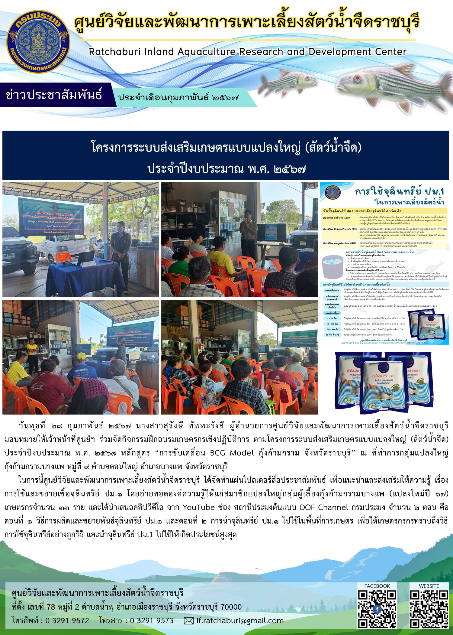 วันพุธที่ 28 กุมภาพันธ์ 2567 นางสาวสุรังษี ทัพพะรังสี ผู้อำนวยการศูนย์วิจัยและพัฒนาการเพาะเลี้ยงสัตว์น้ำจืดราชบุรี มอบหมายให้เจ้าหน้าที่ศูนย์ฯ ร่วมจัดกิจกรรมฝึกอบรมเกษตรกรเชิงปฏิบัติการ ตามโครงการระบบส่งเสริมเกษตรแบบแปลงใหญ่ (สัตว์น้ำจืด)ประจำปีงบประมาณ พ.ศ.2567 หลักสูตร "การขับเคลื่อน BCG Mode! กุ้งก้ามกราม จังหวัดราชบุรี" ณ ที่ทำการกลุ่มแปลงใหญ่กุ้งก้ามกรามบางแพ หมู่ที่ ๙ ตำบลดอนใหญ่ อำเภอบางแพ จังหวัดราชบุรี บูรณาการงานร่วมกับสำนักงานประมงจังหวัดราชบุรี