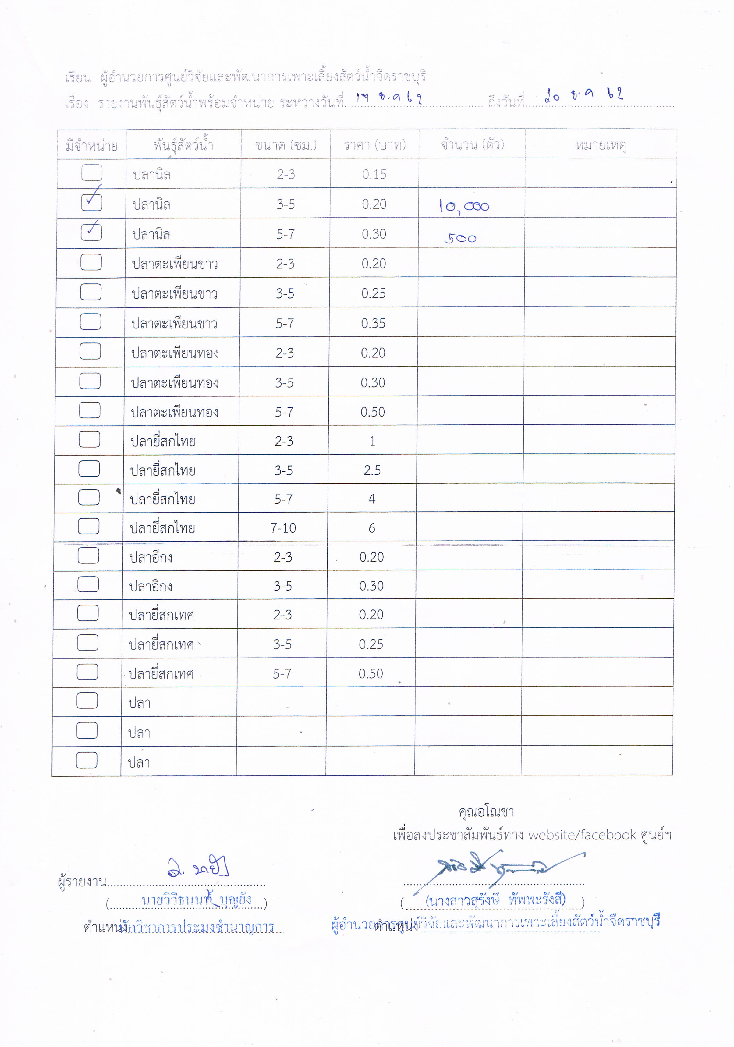 รายงานพันธุ์สัตว์น้ำพร้อมจำหน่าย ระหว่างวันที่ 17 ธันวาคม 2562 ถึงวันที่ 20 ธันวาคม 2562