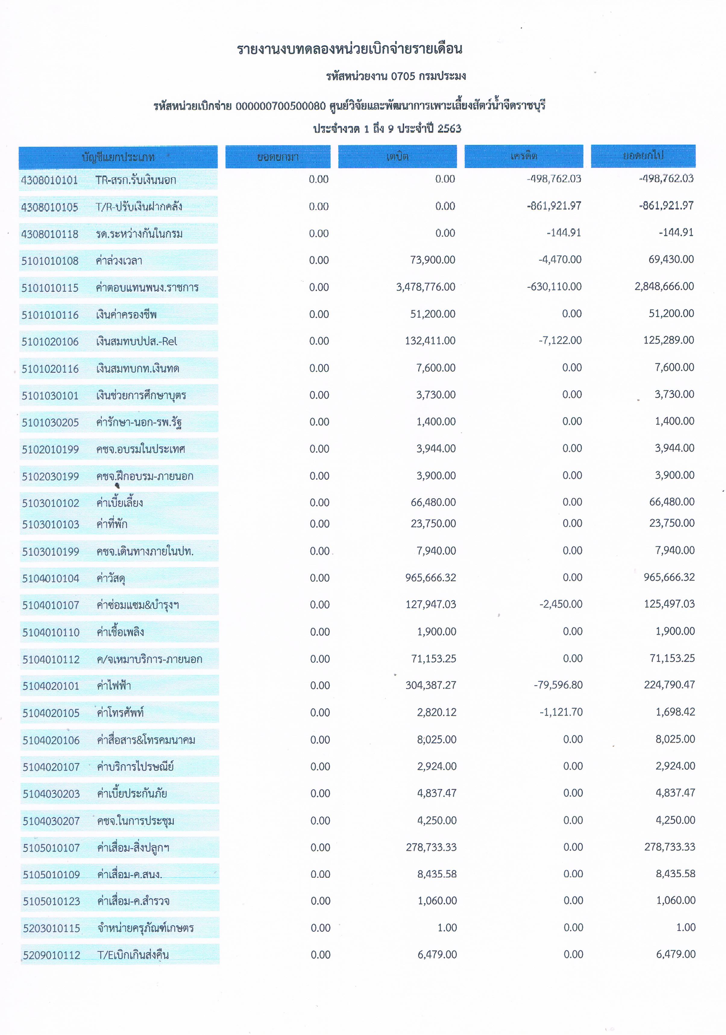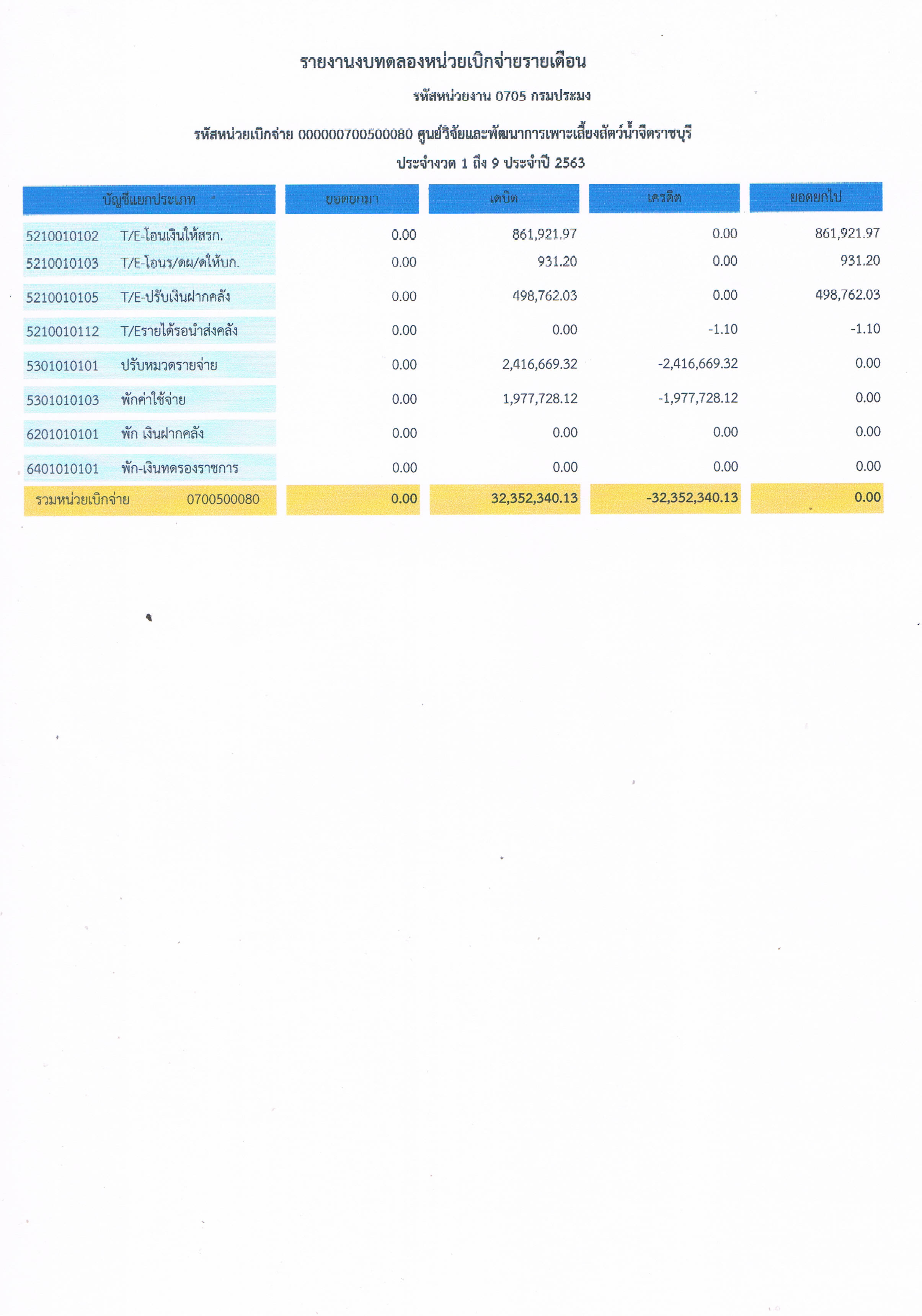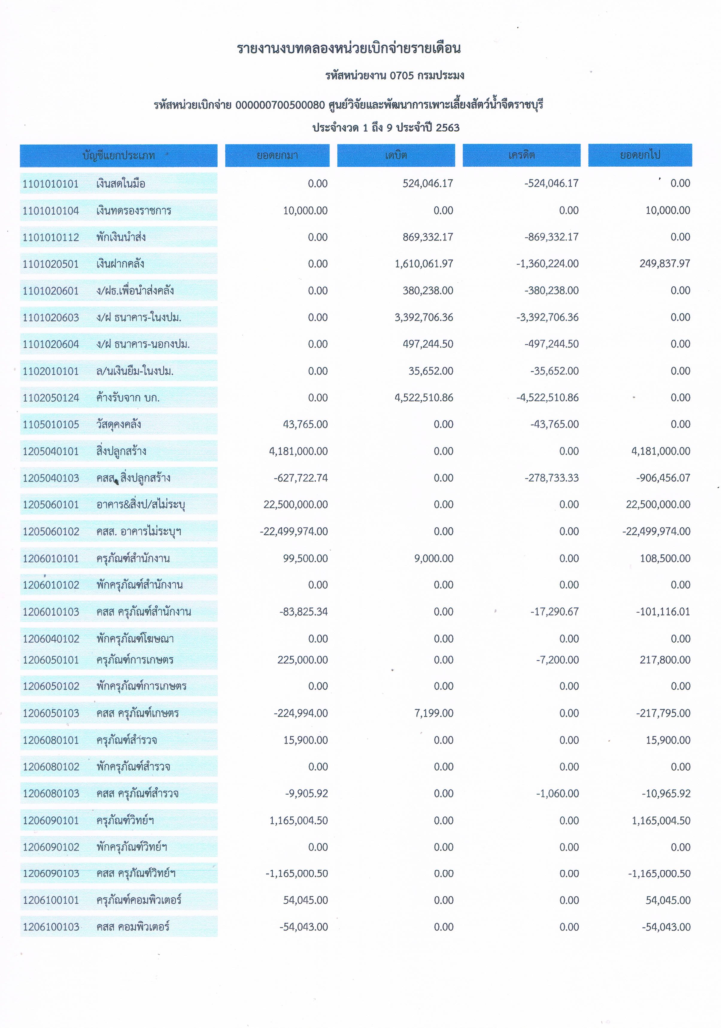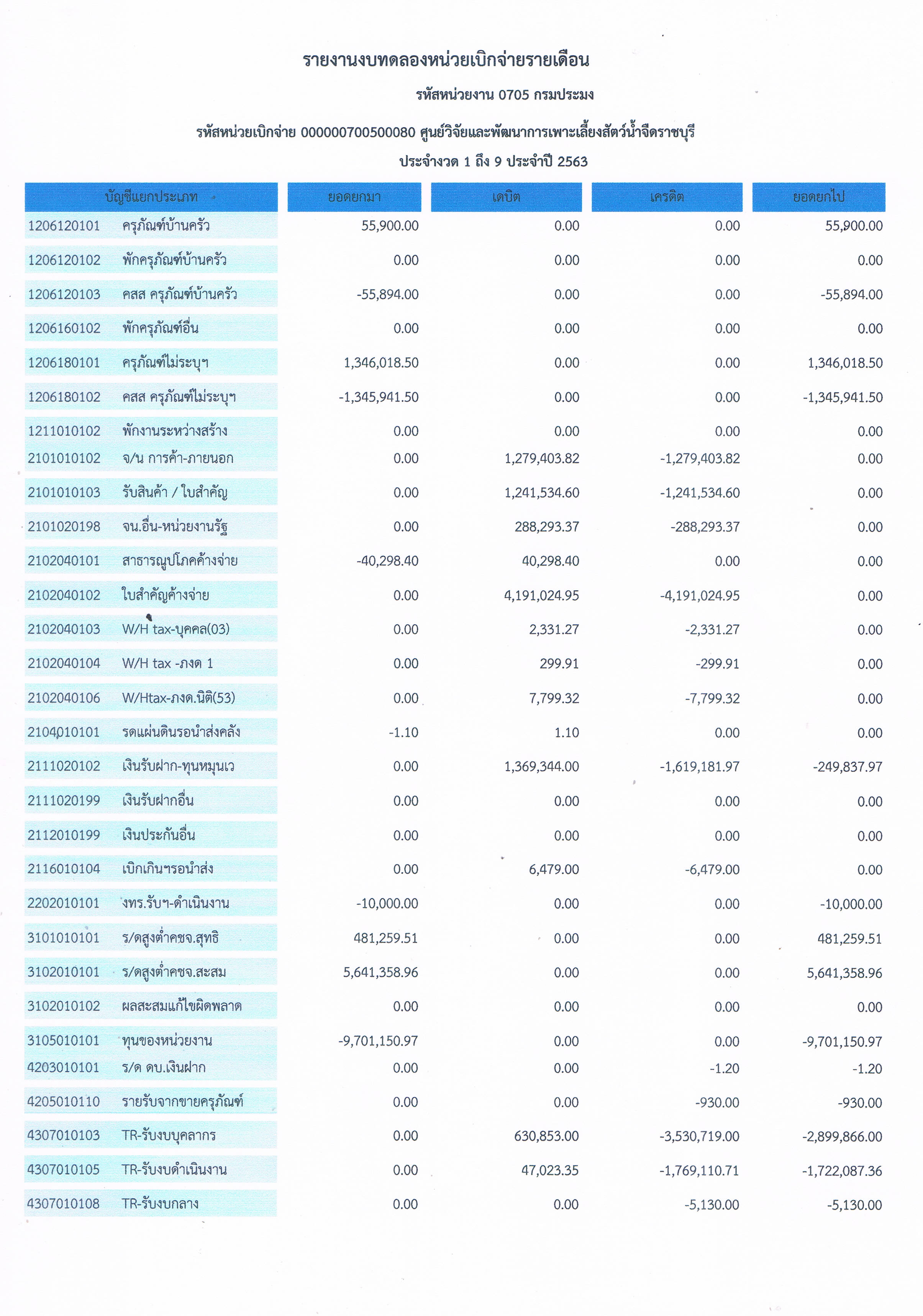 รายงานงบทดลองหน่วยงานเบิกจ่ายรายเดือน มิถุนายน 2563 ศูนย์วิจัยและพัฒนาการเพาะเลี้ยงสัตว์น้ำจืดราชบุรี