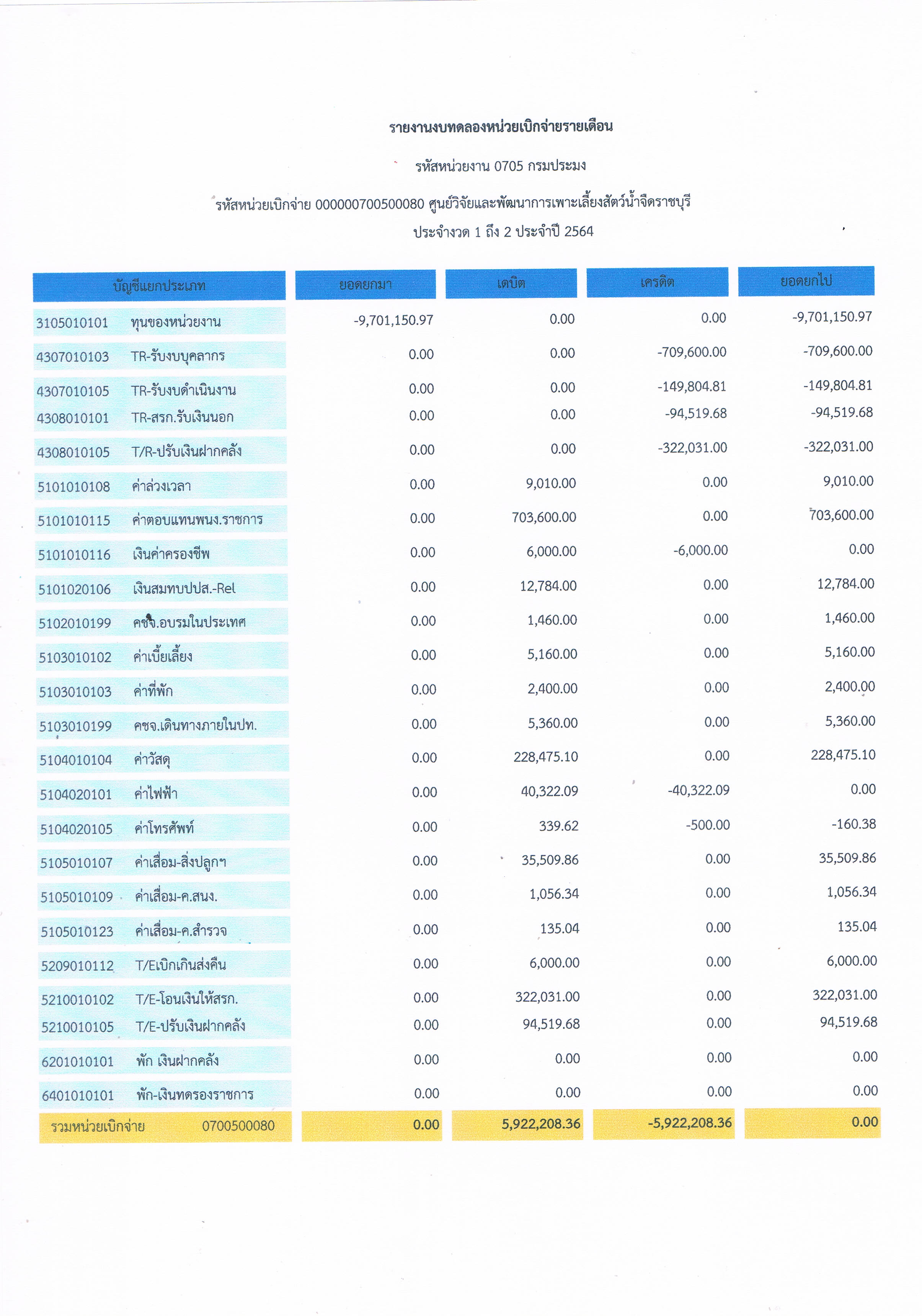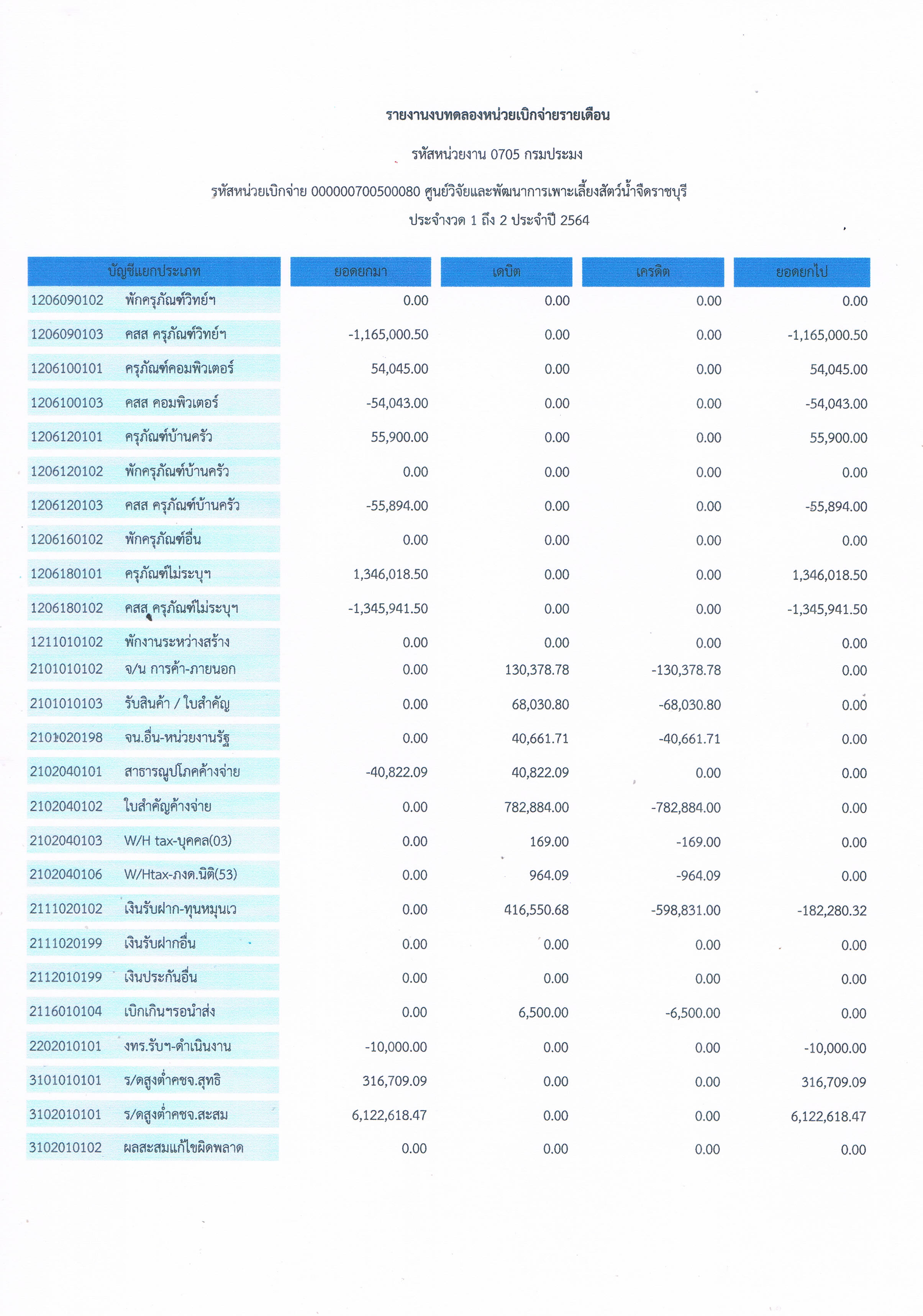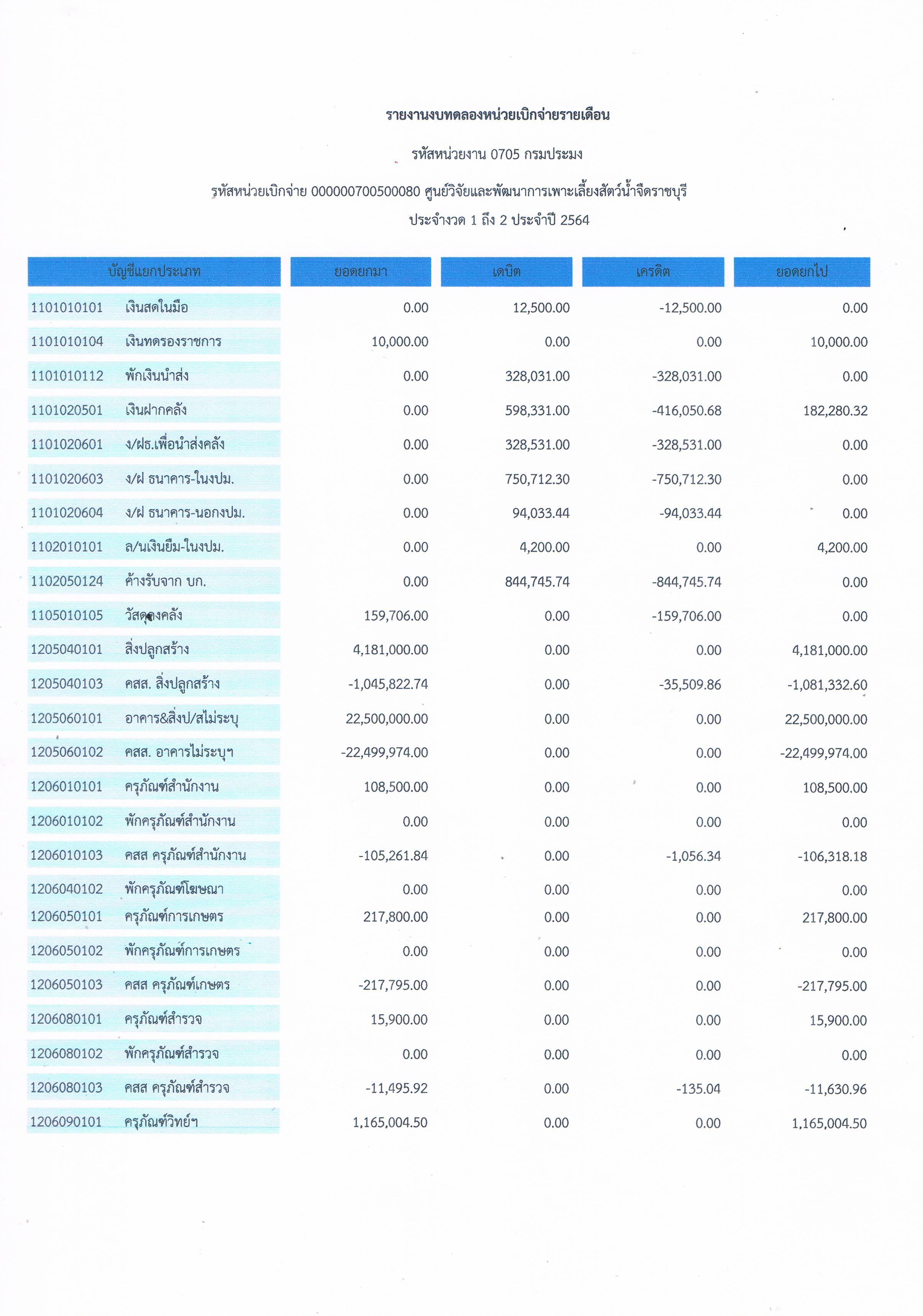 รายงานงบทดลองหน่วยงานเบิกจ่ายรายเดือน พฤศจิกายน 2563 ศูนย์วิจัยและพัฒนาการเพาะเลี้ยงสัตว์น้ำจืดราชบุรี