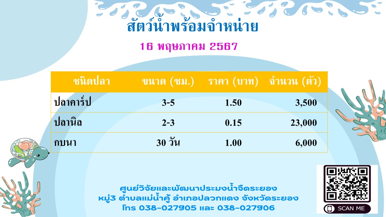 สัตว์น้ำพร้อมจำหน่าย วันที่ 16 พฤษภาคม 2567
