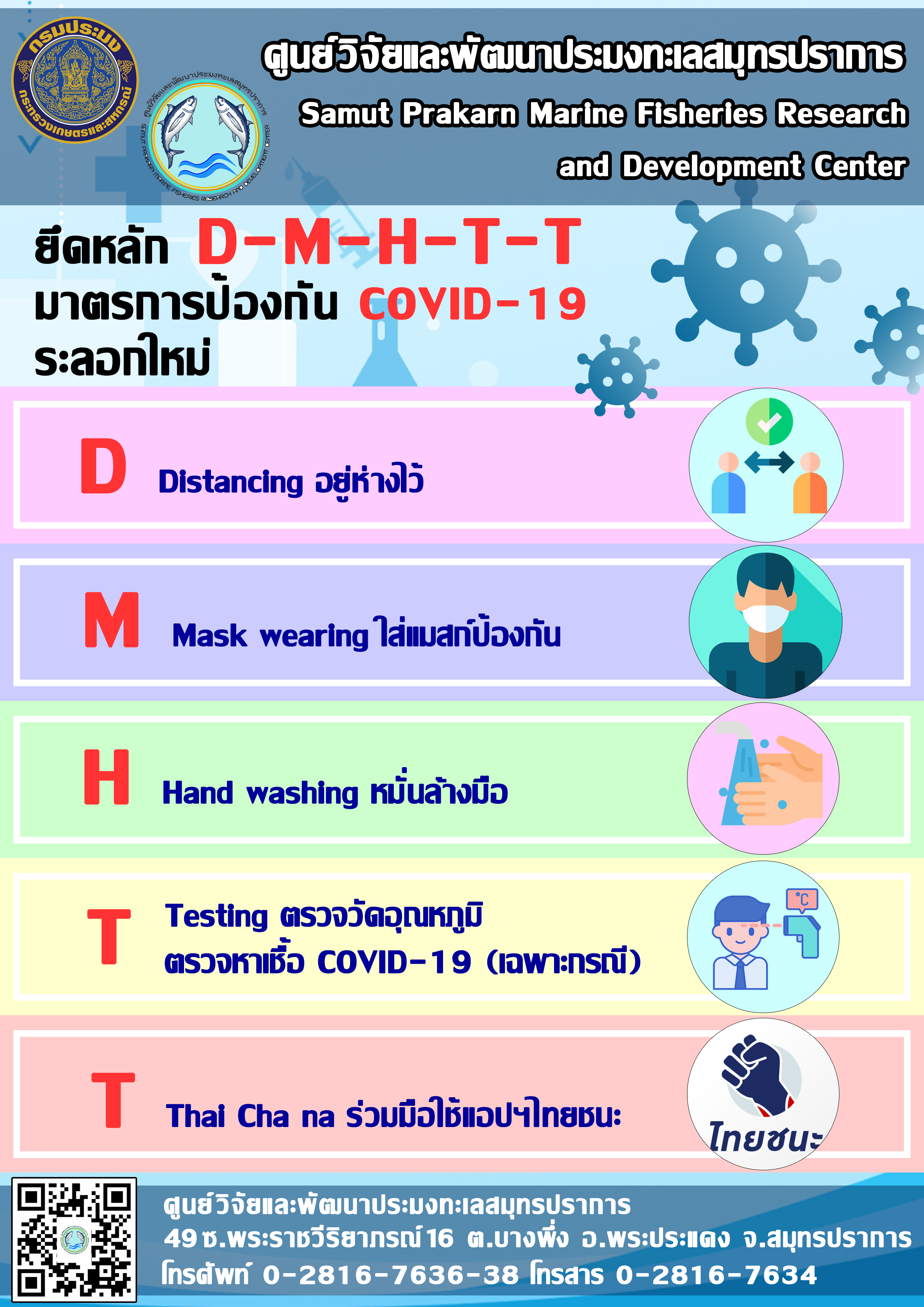 ศูนย์วิจัยและพัฒนาประมงทะเลสมุทรปราการ ขอเชิญชวนยึดหลัก D-M-H-T-T มาตรการป้องกัน COVID-19 ระลอกใหม่