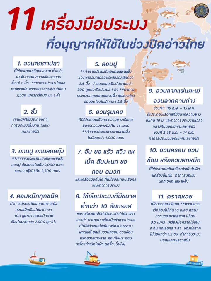 กำหนดให้ภายในระยะเวลาตั้งแต่วันที่ 15 กุมภาพันธ์ ถึงวันที่ 15 พฤษภาคมของทุกปี และภายในระยะเวลาตั้งแต่วันที่ 16 พฤษภาคม ถึงวันที่ 14 มิถุนายน ของทุกปี ห้ามไม่ให้ผู้ใดทำการประมงในพื้นที่บางส่วนของจังหวัดประจวบคีรีขันธ์ ชุมพร และสุราษฎธานี โดยยกเว้นการทำการประมงที่ใช้เครื่องมือ วิธีการทำการประมง และปฏิบัติตามเงื่อนไขดังนี้