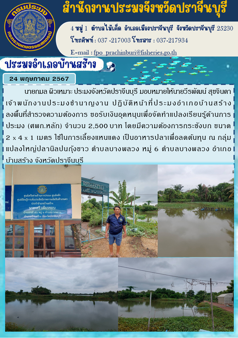 ข่าวประชาสัมพันธ์ ประมงอำเภอบ้านสร้าง ลงพื้นที่สำรวจความต้องการ ขอรับเงินอุดหนุนเพื่อจัดทำแปลงเรียนรู้ด้านการ ประมง (ศพก.หลัก)