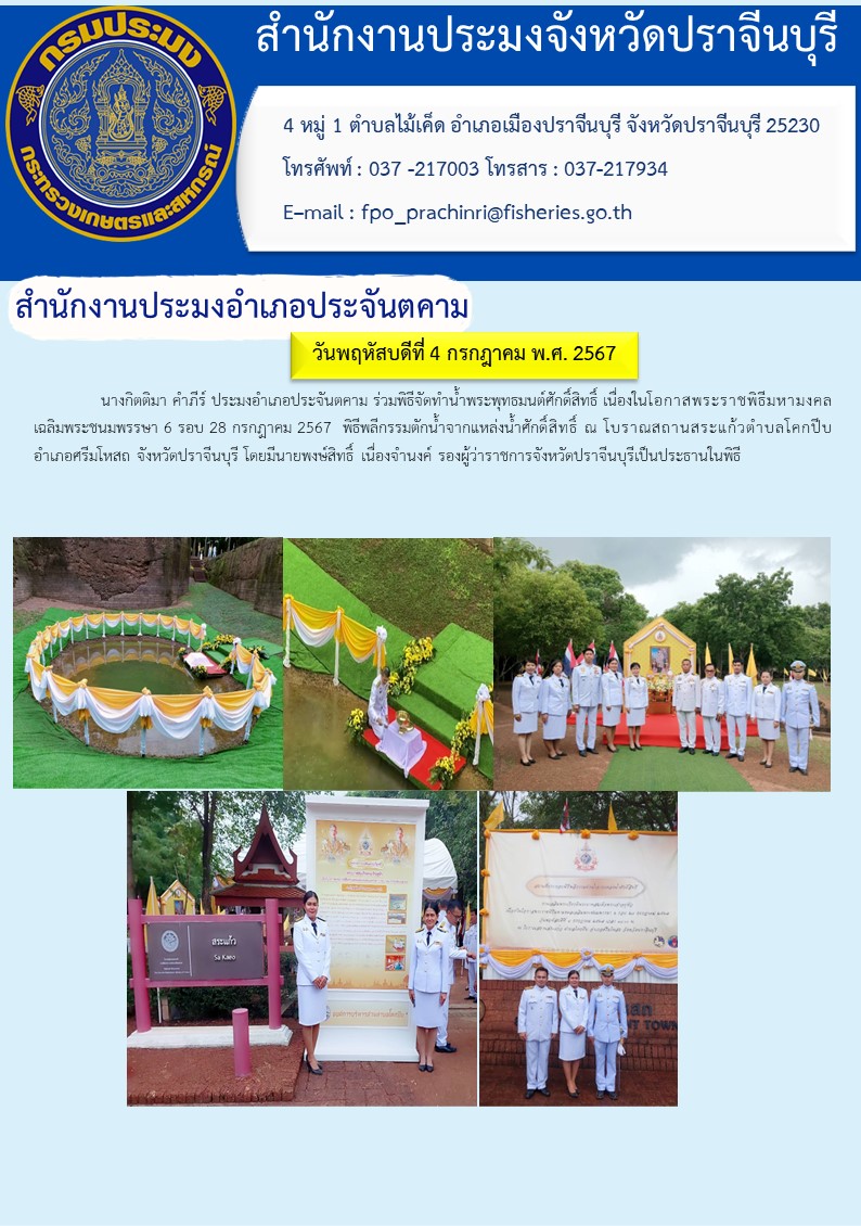 ข่าวประชาสัมพันธ์ สำนักงานประมงอำเภอประจันตคาม นางกิตติมา คำภีร์ ประมงอำเภอประจันตคาม ร่วมพิธีจัดทำน้ำพระพุทธมนต์ศักดิ์สิทธิ์ เนื่องในโอกาสพระราชพิธีมหามงคล เฉลิมพระชนมพรรษา 6 รอบ 28 กรกฎาคม 2567 พิธีพลีกรรมตักน้ำจากแหล่งน้ำศักดิ์สิทธิ์