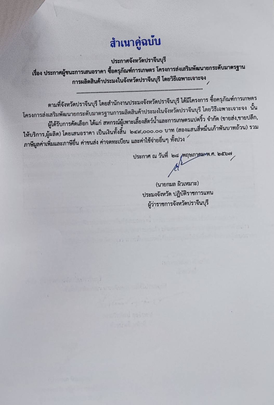 ประกาศผู้ชนะเสนอราคา จัดซื้อครุภัณฑ์การเกษตร โครงการส่งเสริมพัฒนายกระดับมาตรฐานการผลิตสินค้าประมงในจังหวัดปราจีนบุรี