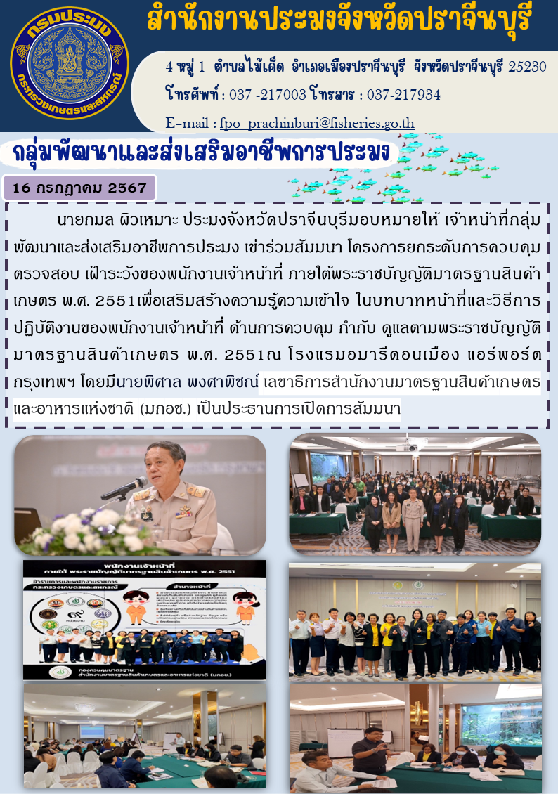 ข่าวประชาสัมพันธ์ กลุ่มพัฒนาและส่งเสริมอาชีพการประมง เข้าร่วมสัมมนาโครงการยกระดับการควบคุมตรวจสอบ เฝ้าระวังของพนักงานเจ้าหน้าที่ ภายใต้พระราชบัญญัติมาตรฐานสินค้าเกษตร พ.ศ. 2551