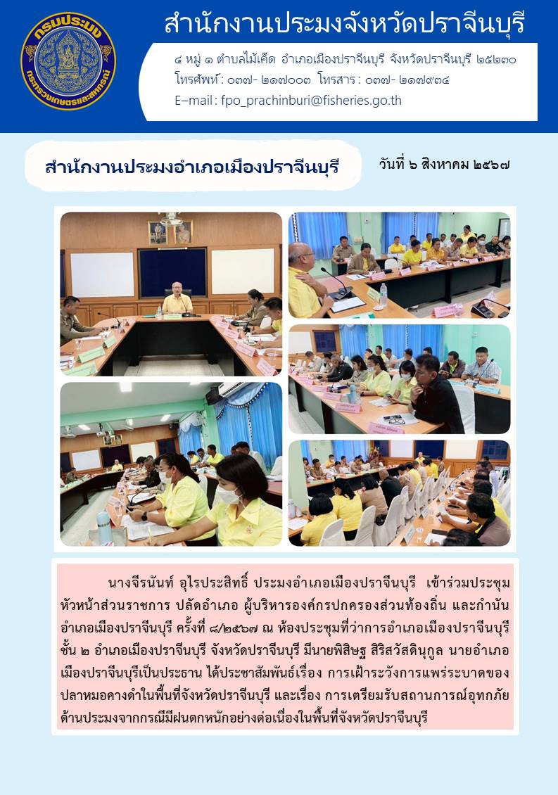 ข่าวประชาสัมพันธ์ สำนักงานประมงอำเภอเมืองปราจีนบุรี เข้าร่วมประชุม หัวหน้าส่วนราชการ ปลัดอำเภอ ผู้บริหารองค์กรปกครองส่วนท้องถิ่น และกำนัน อำเภอเมืองปราจีนบุรี ครั้งที่ ๔/๒๕๖๗