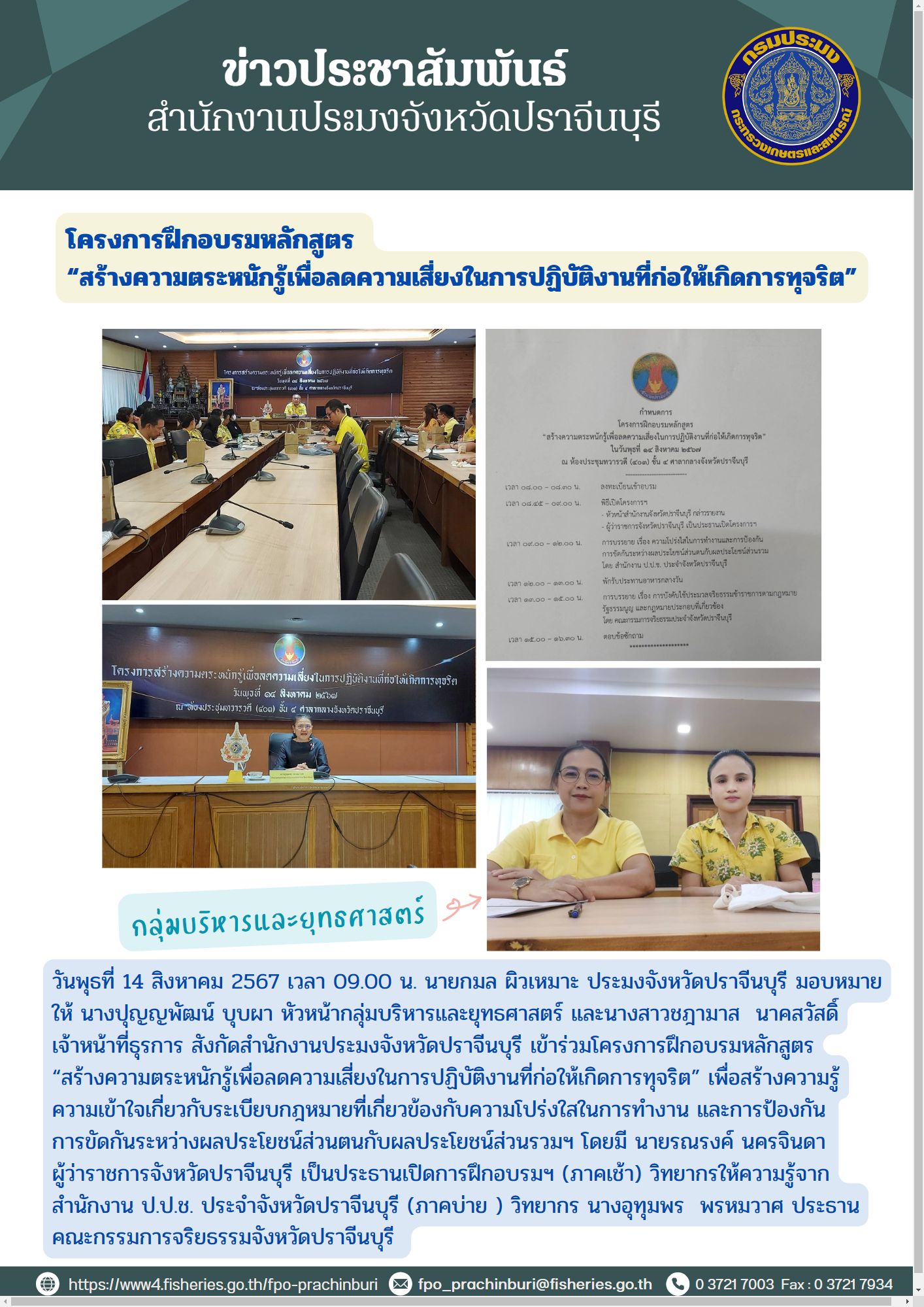 ข่าวประชาสัมพันธ์ กลุ่มบริหารและยุทธศาสตร์ โครงการฝึกอบรมหลักสูตร “สร้างความตระหนักรู้เพื่อลดความเสี่ยงในการปฏิบัติงานที่ก่อให้เกิดการทุจริต”