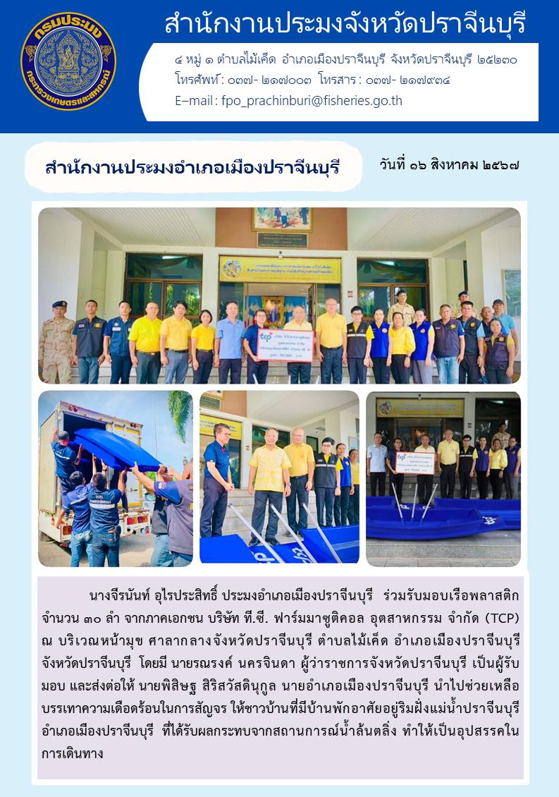 ข่าวประชาสัมพันธ์ สำนักงานประมงอำเภอเมืองปราจีนบุรี ร่วมรับมอบเรือพลาสติก จำนวน ๓๐ ลำ จากภาคเอกชน บริษัท ที.ซี. ฟาร์มมาซูติคอล อุตสาหกรรม จำกัด (TCP)