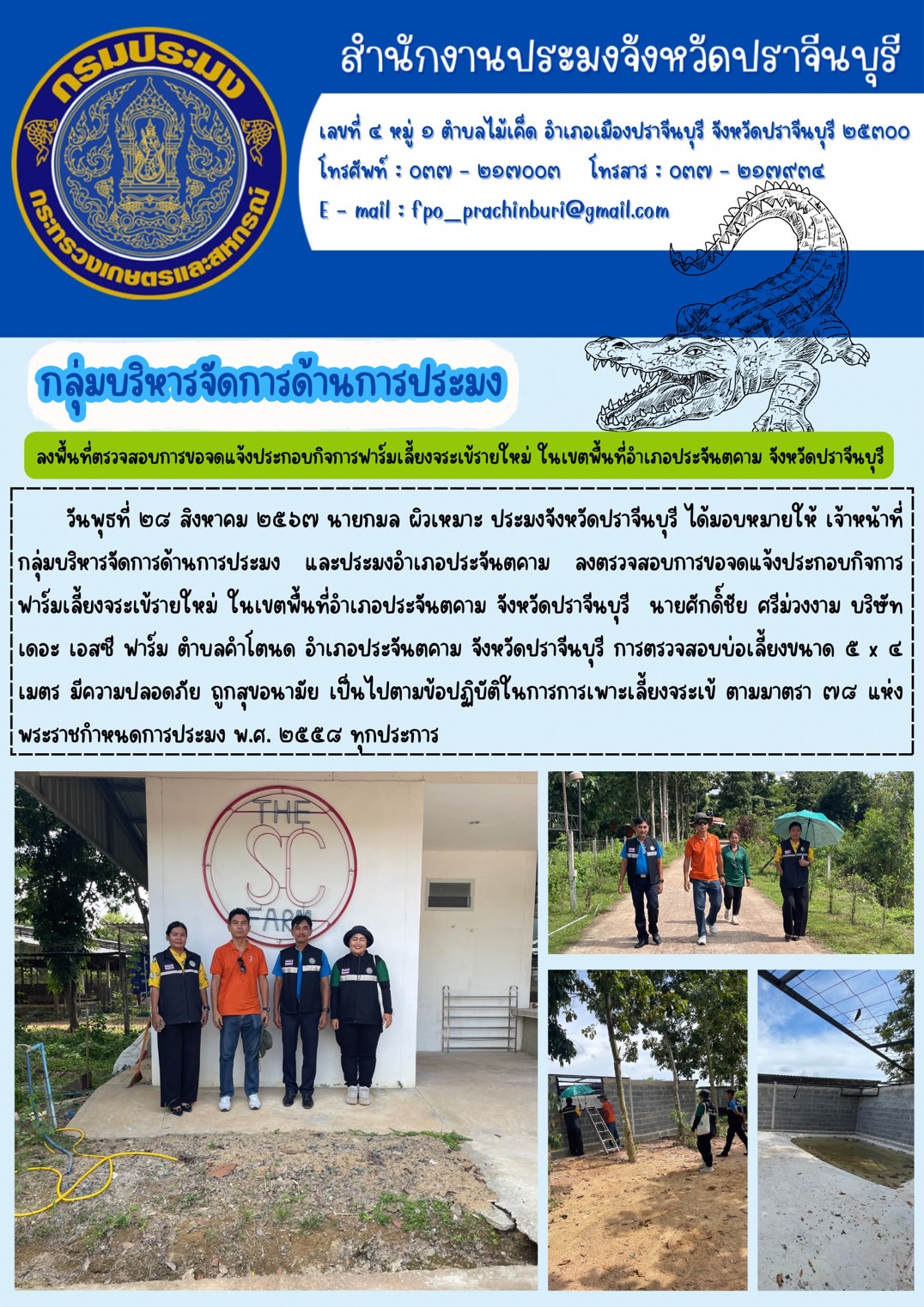ข่าวประชาสัมพันธ์ กลุ่มบริหารจัดการด้านการประมง ลงตรวจสอบการขอจดแจ้งประกอบกิจการ ฟาร์มเลี้ยงจระเข้รายใหม่
