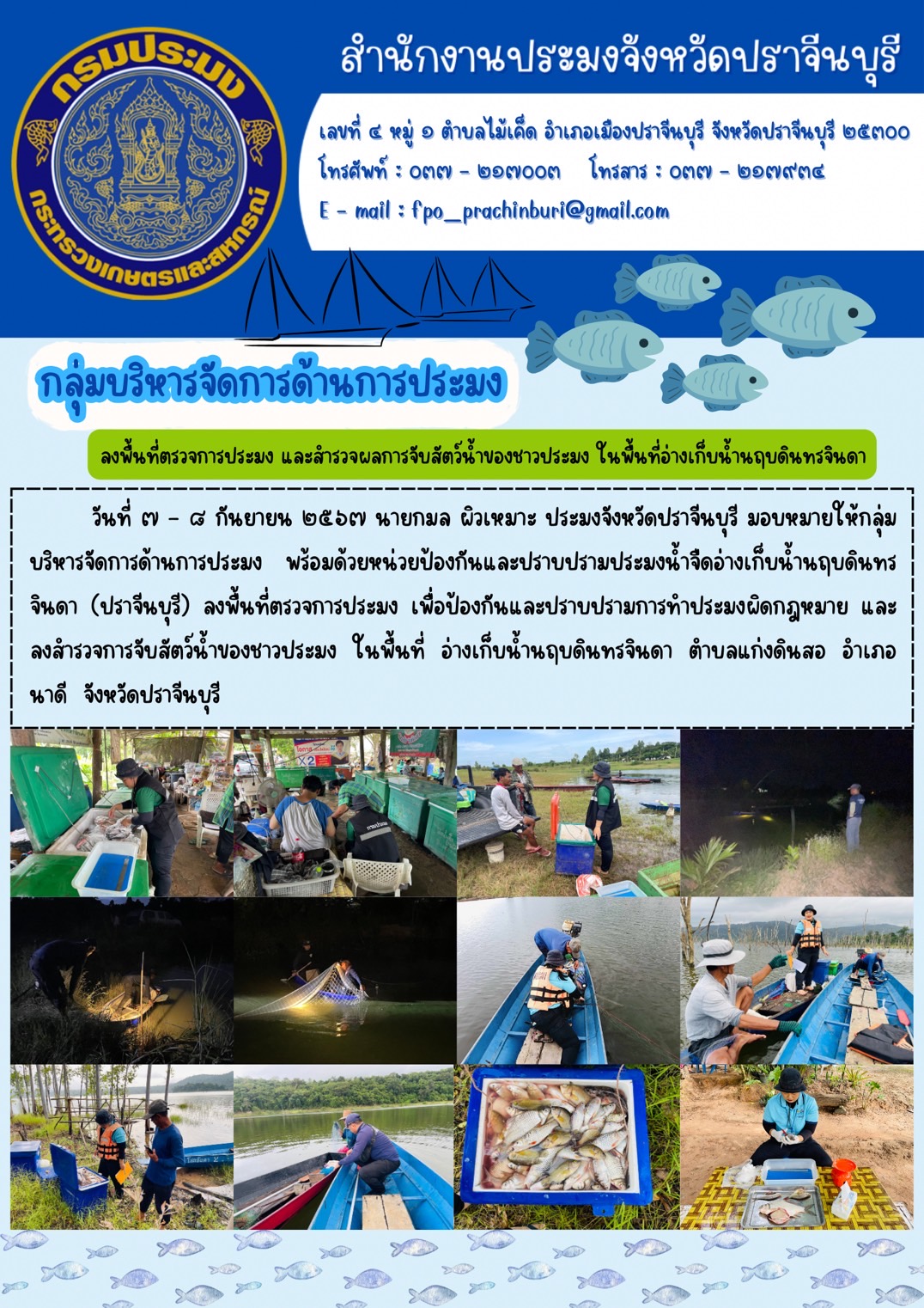 ข่าวประชาสัมพันธ์ กลุ่มบริหารจัดการด้านการประมง ลงพื้นที่ตรวจการประมง และสำรวจผลการจับสัตว์น้ำของชาวประมง ในพื้นที่อ่างเก็บน้ำนฤบดินทรจินดา