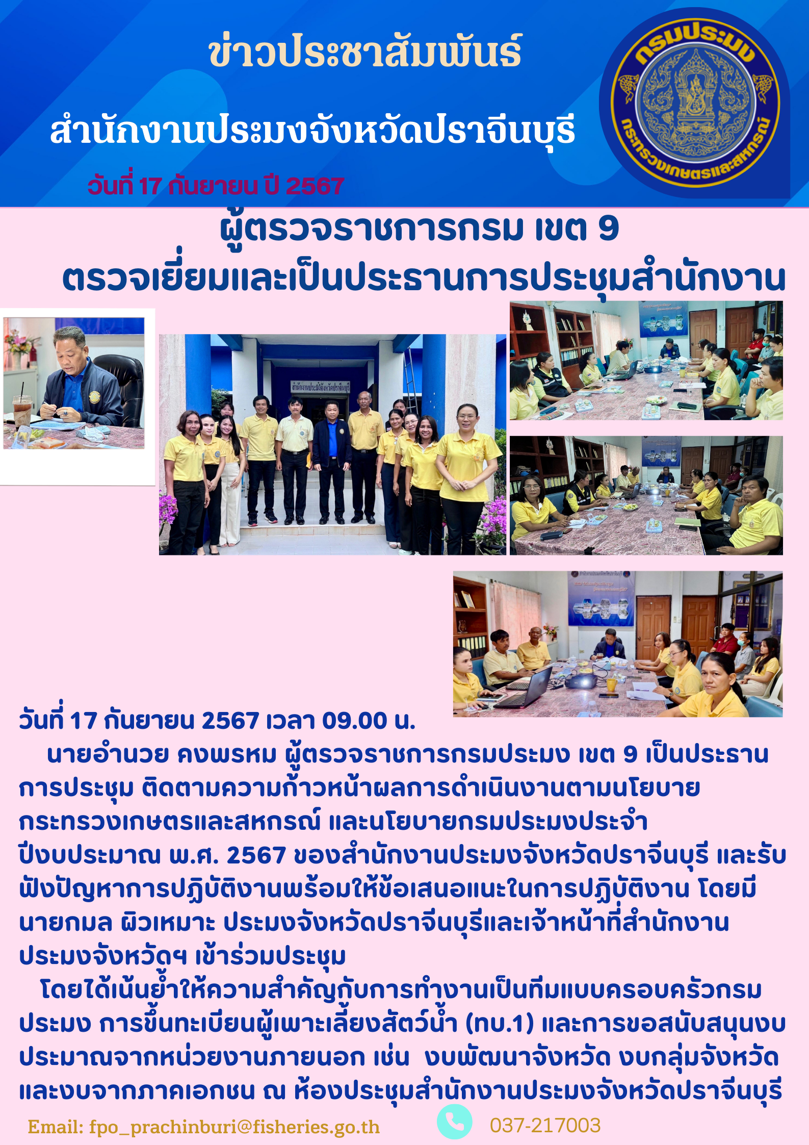 ข่าวประชาสัมพันธ์ การประชุม ติดตามความก้าวหน้าผลการดำเนินงานตามนโยบาย กระทรวงเกษตรและสหกรณ์ และนโยบายกรมประมงประจํา ปีงบประมาณ พ.ศ. 2567