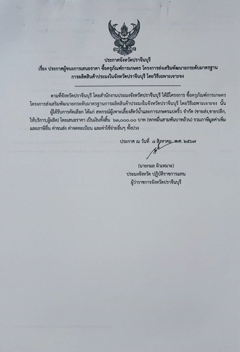 ประกาศผู้ชนะเสนอราคาการจัดซื้อครุภัณฑ์การเกษตร โครงการส่งเสริมพัฒนายกระดับมาตรฐานการผลิตสินค้าประมงในจังหวัดปราจีนบุรี โดยวิธีเฉพาะเจาะจง