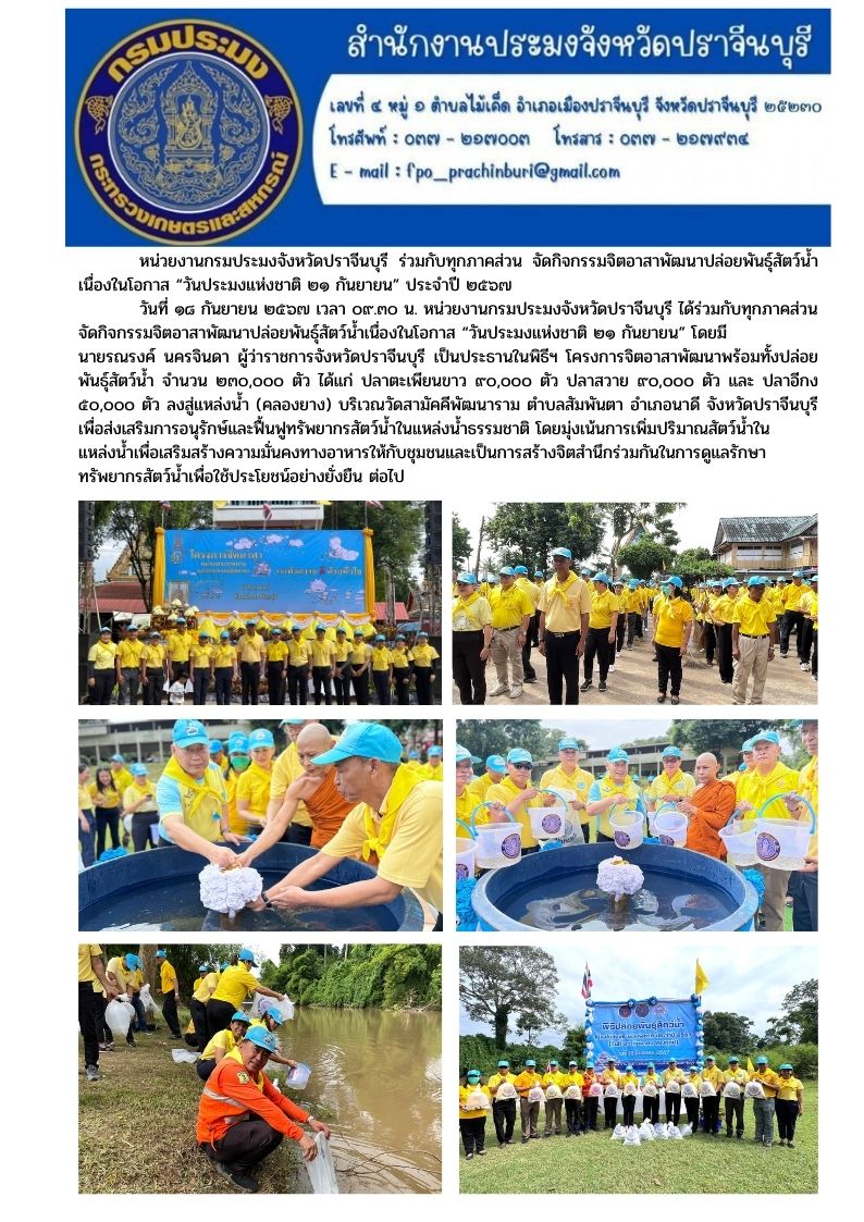 ข่าวประชาสัมพันธ์ จัดกิจกรรมจิตอาสาพัฒนาปล่อยพันธุ์สัตว์น้ำ เนื่องในโอกาส "วันประมงแห่งชาติ ๒๑ กันยายน" ประจําปี ๒๕๖๗