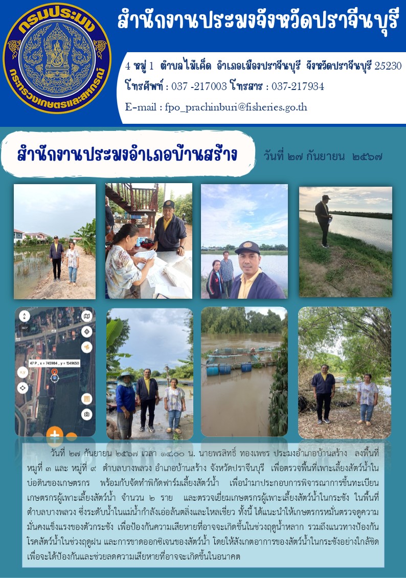 ข่าวประชาสัมพันธ์ สำนักงานประมงอำเภอบ้านสร้าง ลงพื้นที่ หมูที่ ๓ และ หมู่ที่ ๔ ตำบลบางพลวง อำเภอบ้านสร้าง จังหวัดปราจีนบุรี เพื่อตรวจพื้นที่เพาะเลี้ยงสัตว์น้ำ