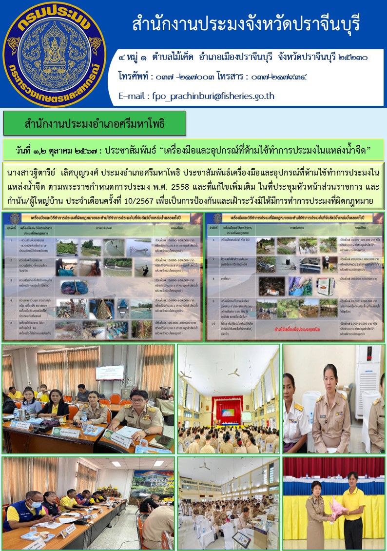 ข่าวประชาสัมพันธ์ สำนักงานประมงอำเภอศรีมหาโพธิ ประชาสัมพันธ์ “เครื่องมือและอุปกรณ์ที่ห้ามใช้ทำการประมงในแหล่งน้ำจืด”