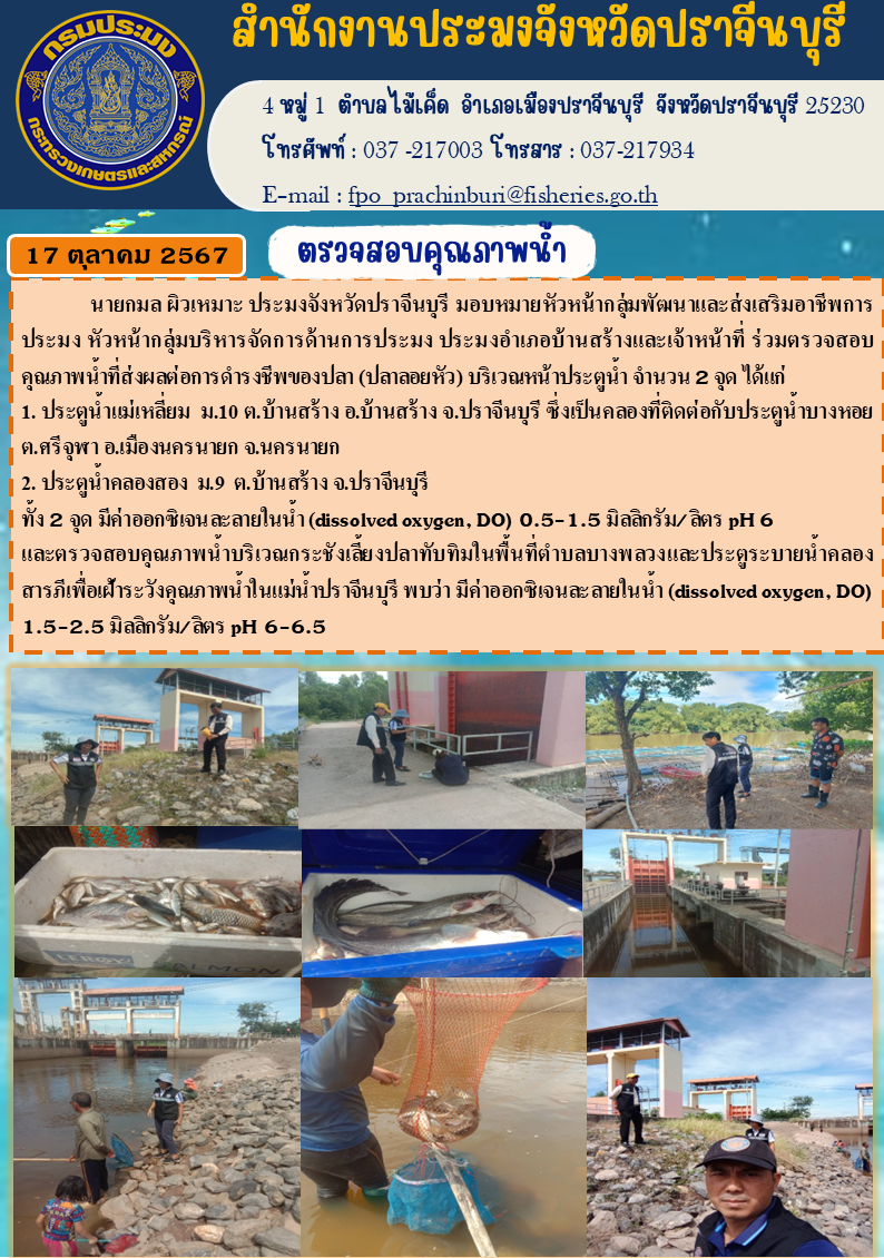 ข่าวประชาสัมพันธ์ วมตรวจสอบ คุณภาพน้ำที่ส่งผลต่อการดำรงชีพของปลา (ปลาลอยหัว) บริเวณหน้าประตูน้ำ จำนวน 2 จุด