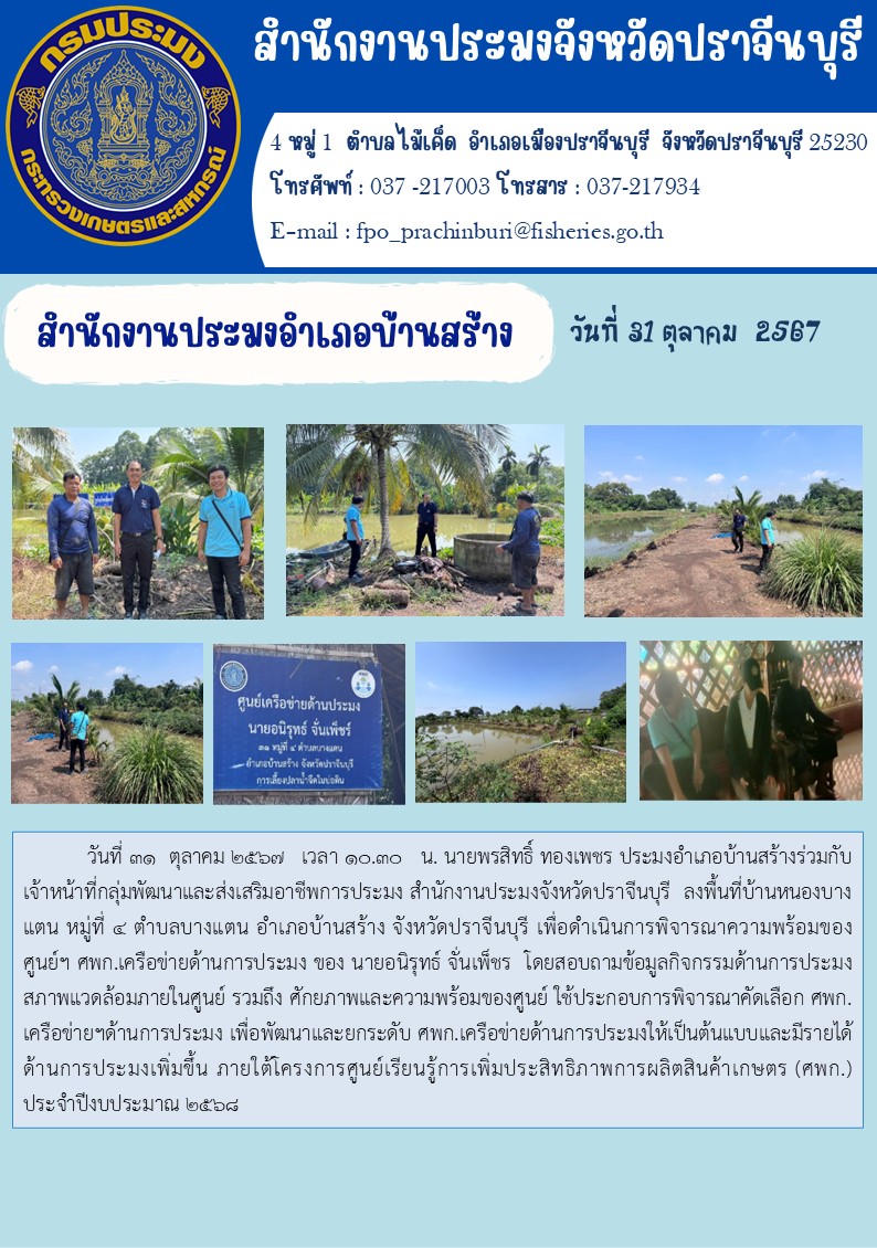ข่าวประชาสัมพันธ์ สำนักงานประมงอำเภอบ้านสร้าง ลงพื้นที่บ้านหนองบาง แตน หมู่ที่ ๔ ตำบลบางแตน อำเภอบ้านสร้าง จังหวัดปราจีนบุรี