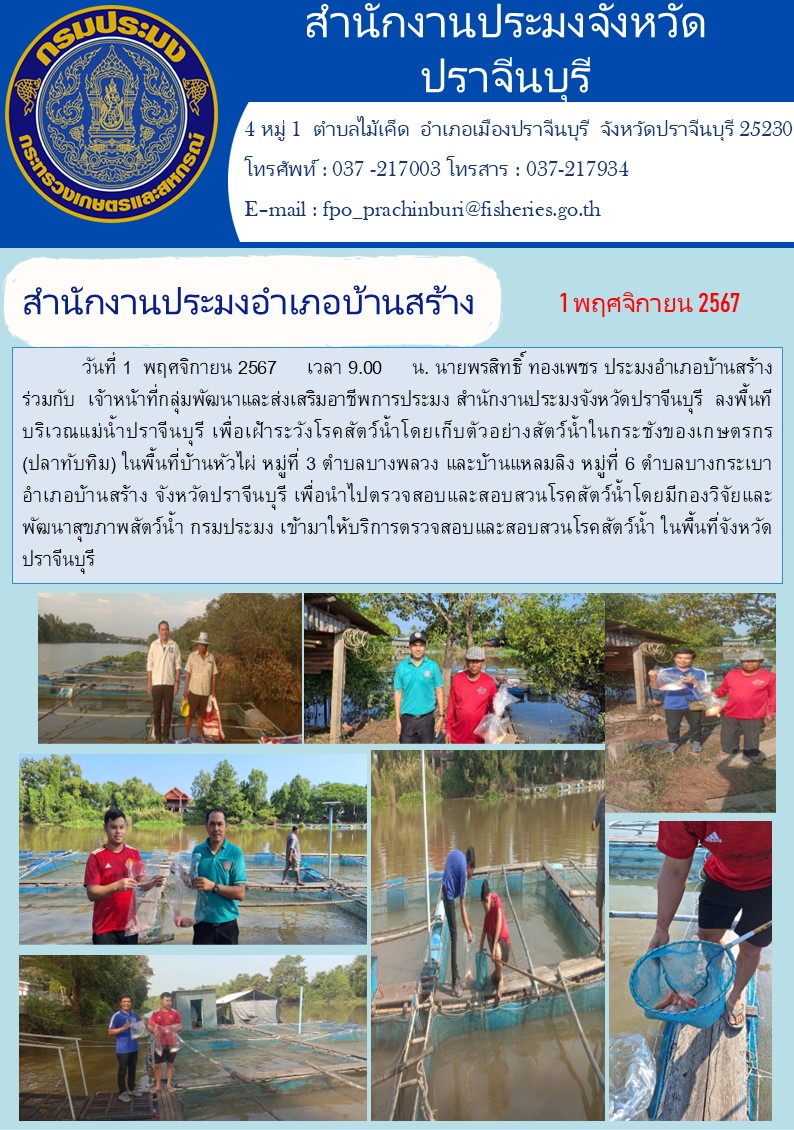 ข่าวประชาสัมพันธ์ สำนักงานประมงอำเภอบ้านสร้าง ลงพื้นที บริเวณแม่น้ำปราจีนบุรี เพื่อเฝ้าระวังโรคสัตว์น้ำโดยเก็บตัวอย่างสัตว์น้ำในกระชังของเกษตรกร (ปลาทับทิม)