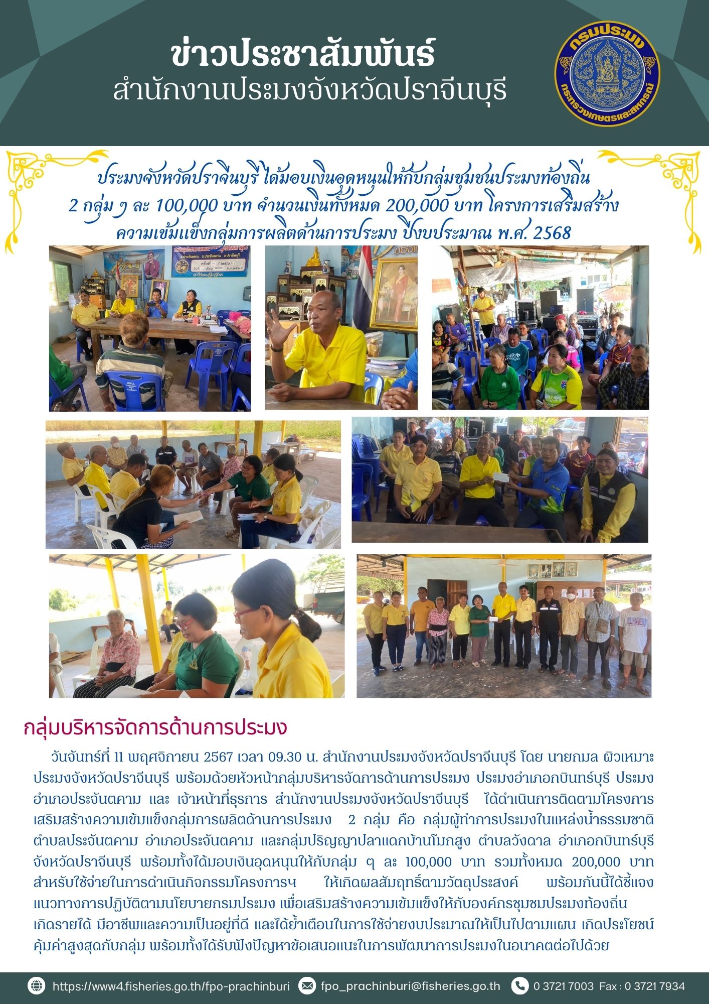 ข่าวประชาสัมพันธ์ กลุ่มบริหารจัดการด้านการประมง ประมงจังหวัดปราจีนบุรีได้มอบเงินอุดหนุนให้กับกลุ่มชุมชนประมงท้องถิ่น 2 กลุ่ม ๆ ละ 100,000 บาท จำนวนเงินทั้งหมด 200,000 บาท โครงการเสริมสร้าง ความเข้มแข็งกลุ่มการผลิตด้านการประมง ปีงบประมาณ พ.ศ. 2568