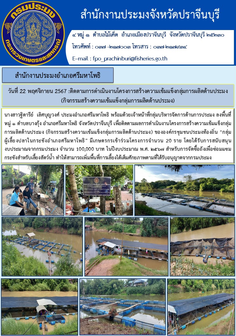 ข่าวประชาสัมพันธ์ สำนักงานประมงอำเภอศรีมหาโพธิ ติดตามการดำเนินงานโครงการสร้างความเข้มแข็งกลุ่มการผลิตด้านประมง (กิจกรรมสร้างความเข้มแข็งกลุ่มการผลิตด้านประมง)