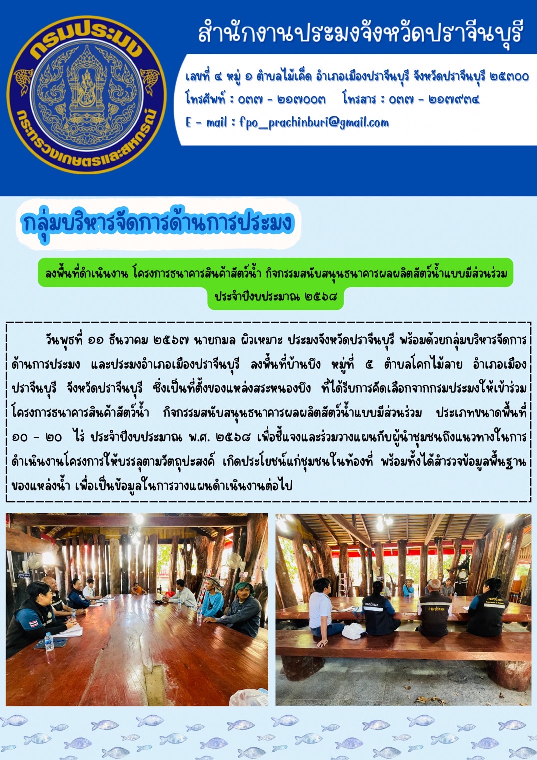 [2026-04-24] ประกาศผู้ชนะการเสนอราคา การจัดซื้อวัสดุสำนักงาน โดยวิธีเฉพาะเจาะจง.. [2026-04-20] ข่าวประชาสัมพันธ์ กลุ่มบริหารจัดการด้านการประมง ลงพื้นที่ตรวจเยี่ยมจุด.. [2026-04-20] ข่าวประชาสัมพันธ์ กลุ่มพัฒนาและส่งเสริมอาชีพการประมง จำหน่ายกุ้งก้ามกร.. [2026-04-20] ข่าวประชาสัมพันธ์ กิจกรรมวันสงกรานต์.. [2026-04-20] ข่าวประชาสัมพันธ์ ลงพื้นที่เพื่อประชาสัมพันธ์โครงการยกระดับสินค้าเกษตร.. [2026-04-20] ข่าวประชาสัมพันธ์ กลุ่มบริหารจัดการด้านการประมง ร่วงพิธีเปิดศูนย์ปฏิบั.. [2026-04-20] ข่าวประชาสัมพันธ์ กลุ่มพัฒนาและส่งเสริมอาชีพการประมง ร่วมปล่อยขบวนรถบร.. [2026-04-20] ข่าวประชาสัมพันธ์ กลุ่มพัฒนาและส่งเสริมอาชีพการประมง ลงพื้นที่สารวจและ.. [2026-04-20] ข่าวประชาสัมพันธ์ กลุ่มบริหารจัดการด้านการประมง ร่วมงานรัฐพิธี "วันพระ.. [2026-04-20] ข่าวประชาสัมพันธ์ ลงพื้นที่เพื่อแนะนำ ชนิดปลา ขนาด ราคา และ ลักษณะทางก.. อ่านทั้งหมด