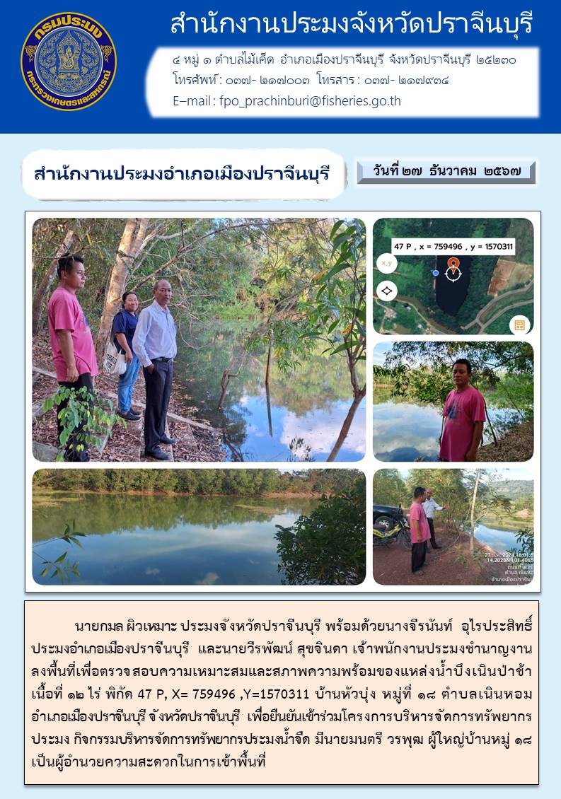 ข่าวประชาสัมพันธ์ สำนักงานประมงอำเภอเมืองปราจีนบุรี ลงพื้นที่เพื่อตรวจสอบความเหมาะสมและสภาพความพร้อมของแหล่งน้ำ