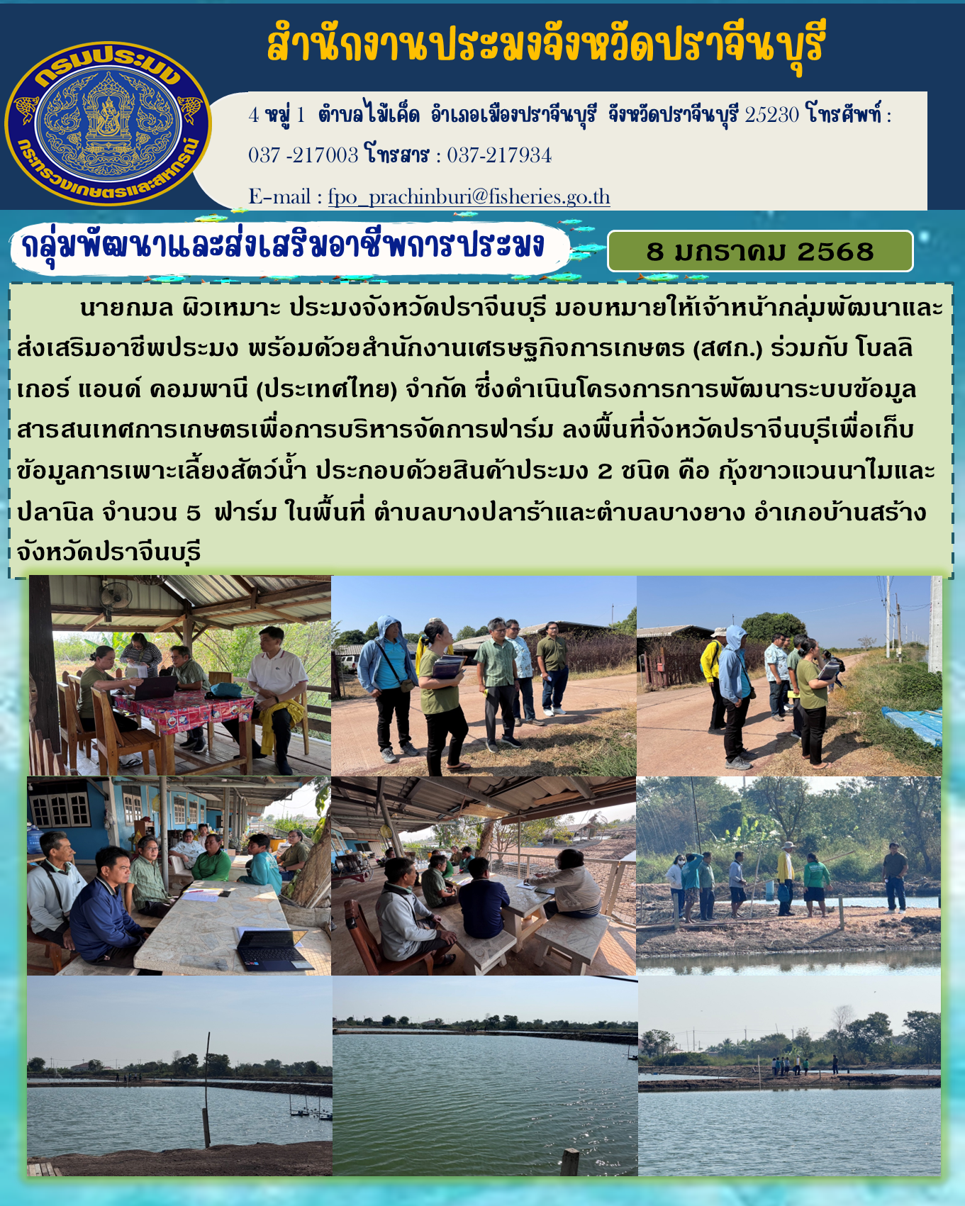 ข่าวประชาสัมพันธ์ กลุ่มพัฒนาและส่งเสริมอาชีพการประมง ลงพื้นที่จังหวัดปราจีนบุรีเพื่อเก็บ ข้อมูลการเพาะเลี้ยงสัตว์น้ำ