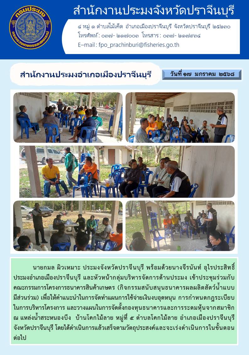 ข่าวประชาสัมพันธ์ สำนักงานประมงอำเภอเมืองปราจีนบุรี เข้าประชุมร่วมกับ คณะกรรมการโครงการธนาคารสินค้าเกษตร (กิจกรรมสนับสนุนธนาคารผลผลิตสัตว์น้ำแบบ มีส่วนร่วม) เพื่อให้คำแนะนำในการจัดทำแผนการใช้จ่ายเงินงบอุดหนุน