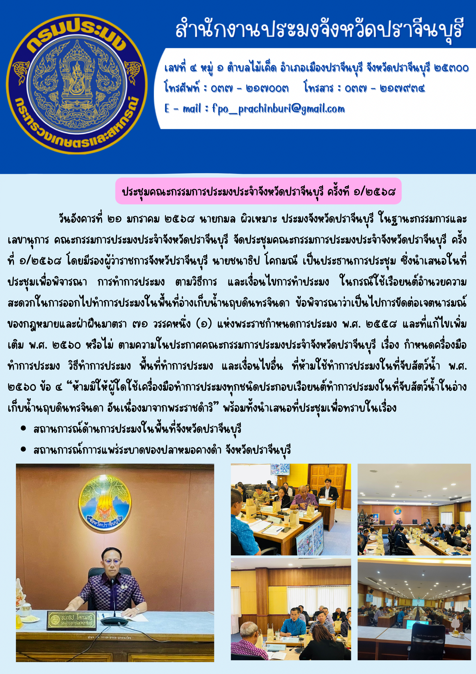 ข่าวประชาสัมพันธ์ ประชุมคณะกรรมการประมงประจำจังหวัดปราจีนบุรี ครั้งที่ ๑/๒๕๖๘