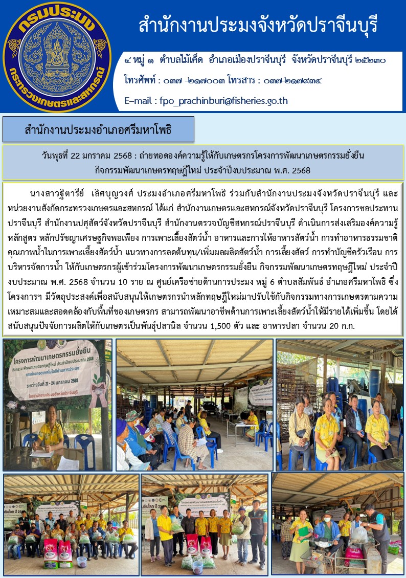 ข่าวประชาสัมพันธ์ สำนักงานประมงอำเภอศรีมหาโพธิ ถ่ายทอดองค์ความรู้ให้กับเกษตรกรโครงการพัฒนาเกษตรกรรมยั่งยืน กิจกรรมพัฒนาเกษตรทฤษฎีใหม่ ประจำปีงบประมาณ พ.ศ. 2568