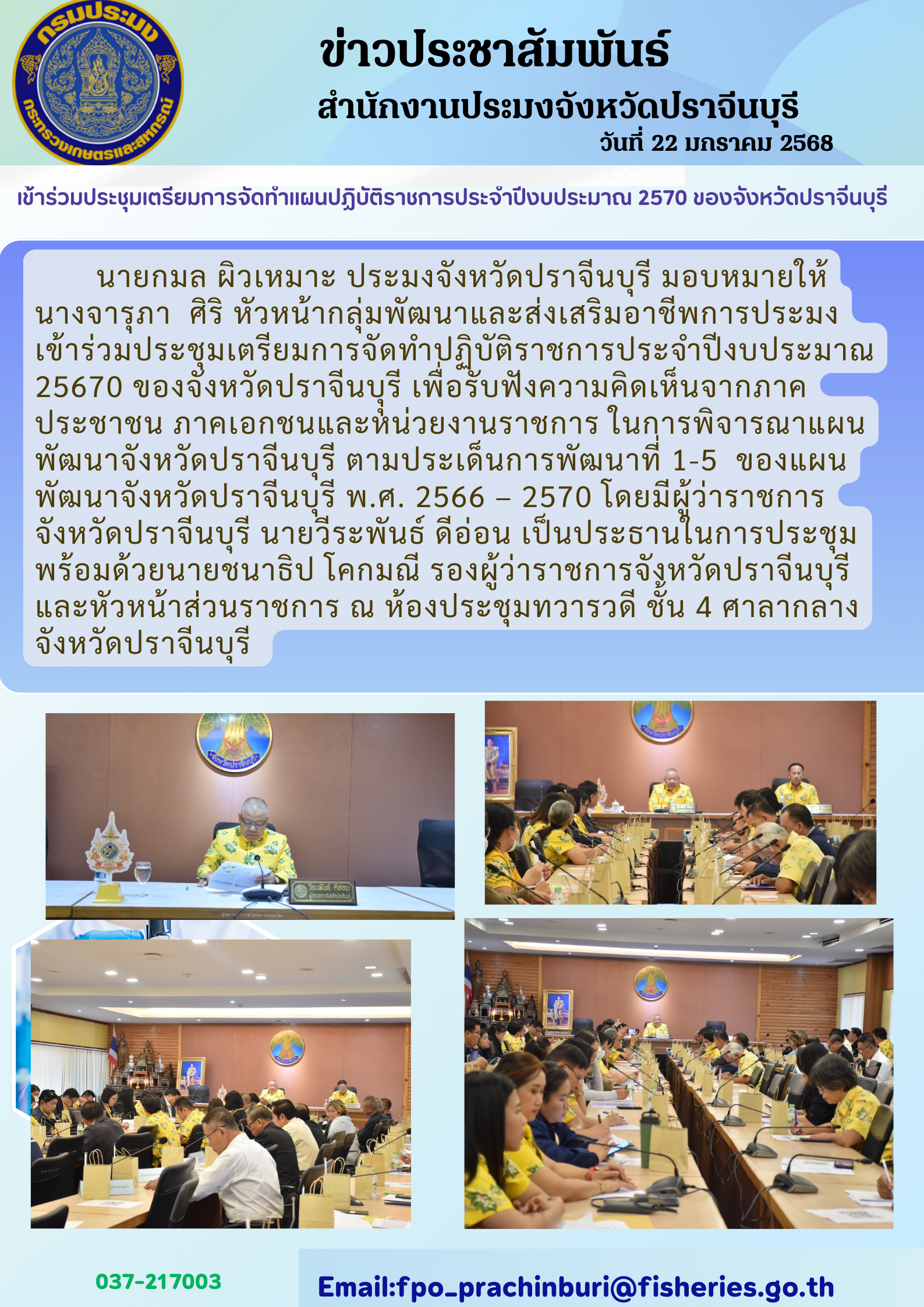 ข่าวประชาสัมพันธ์ เข้าร่วมประชุมเตรียมการจัดทําแผนปฏิบัติราชการประจําปีงบประมาณ 2570 ของจังหวัดปราจีนบุรี