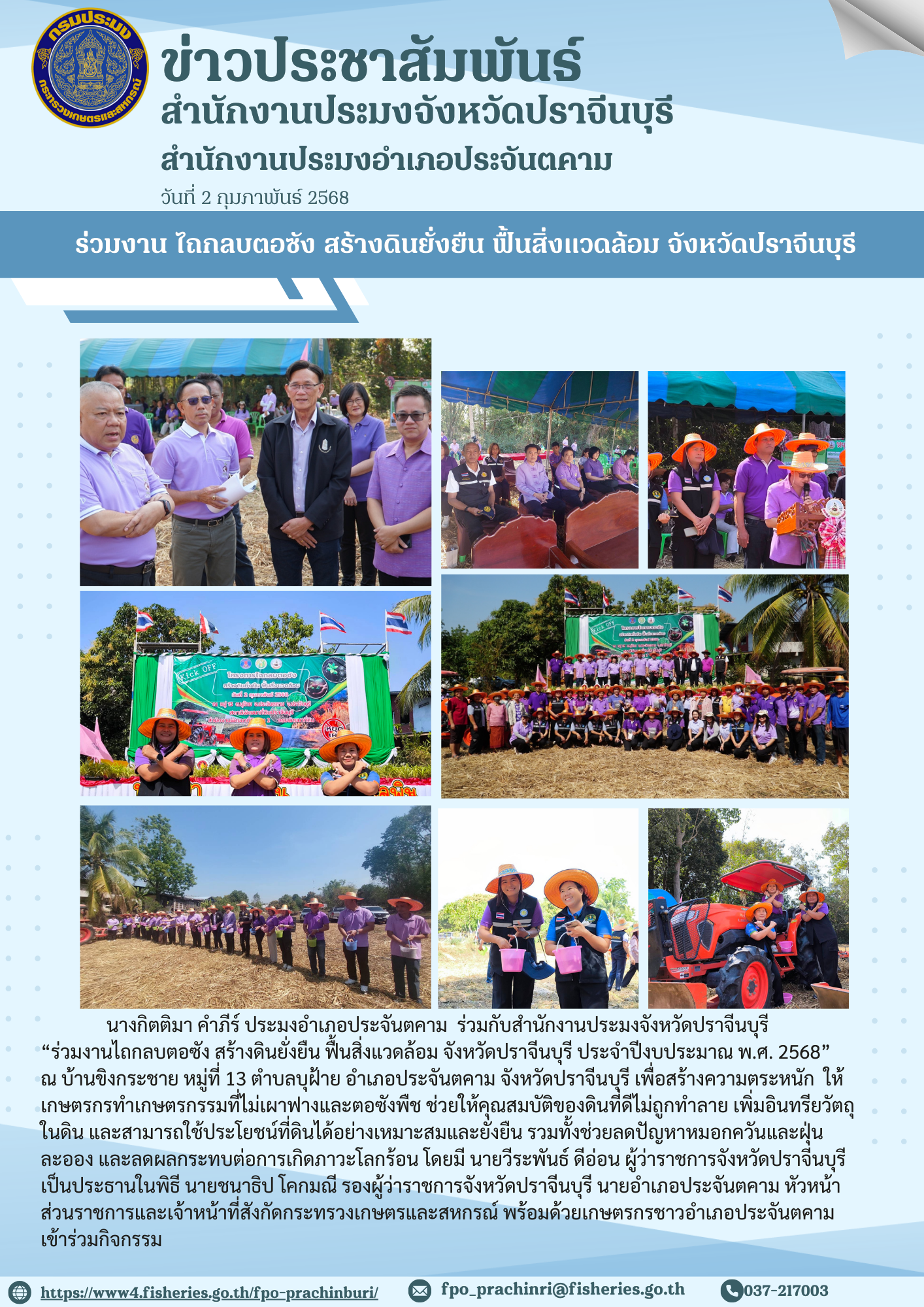 ข่าวประชาสัมพันธ์ ร่วมงานไถกลบตอซัง สร้างดินยั่งยืน ฟื้นสิ่งแวดล้อม จังหวัดปราจีนบุรี ประจำปีงบประมาณ พ.ศ. 2568
