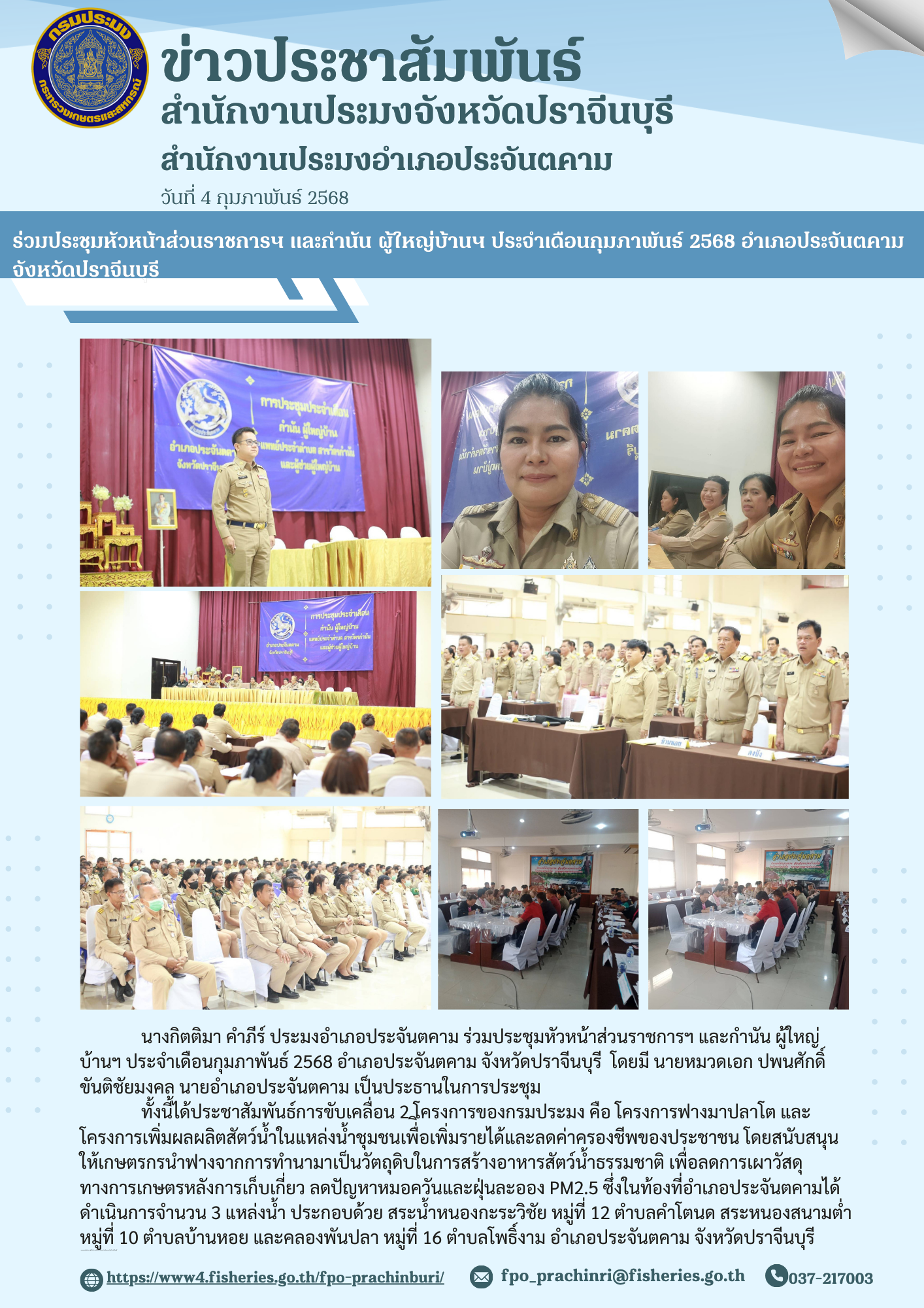 ข่าวประชาสัมพันธ์ ร่วมประชุมหัวหน้าส่วนราชการฯ และก่านั้น ผู้ใหญ่บ้านฯ ประจําเดือนกุมภาพันธ์ 2568 อำาเภอประจันตคาม จังหวัดปราจีนบุรี